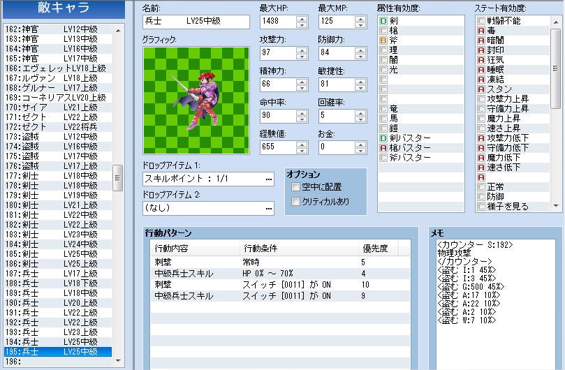 基本的に同じ兵種、同じ装備でレベル違いの敵を作る時は元のデータをコピーしたやつを使って、各ステータスを数ポイントずつ上げるという方法で作る