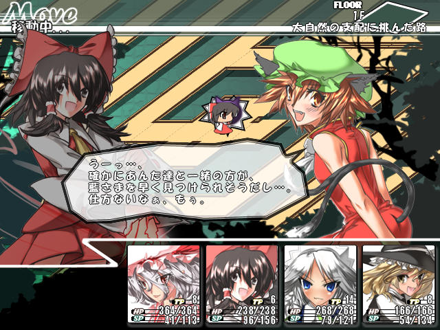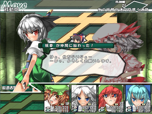 妖夢が仲間になったのはいいんだけど、ステータスは別に突出してないし、何よりスペルの燃費が悪い。4つあるスペルうちの3つが一度使うとSPが不足してもう使えなくなるという使いにくさ。残念。