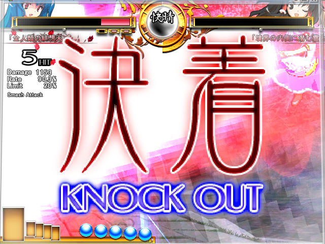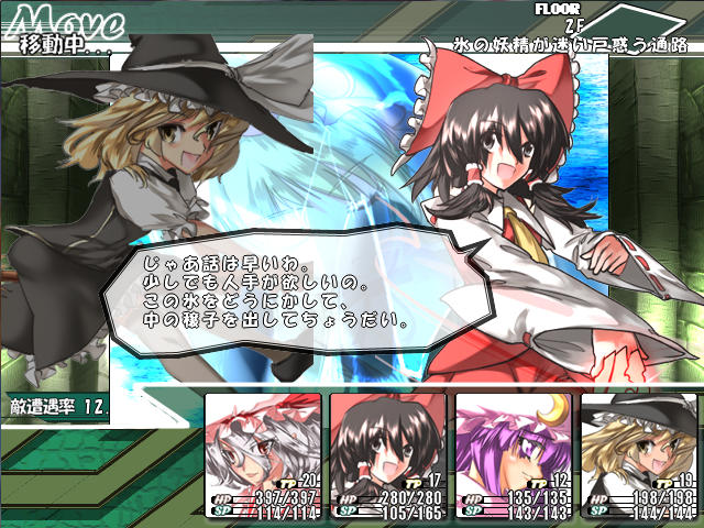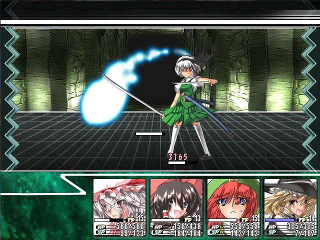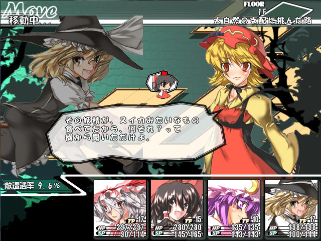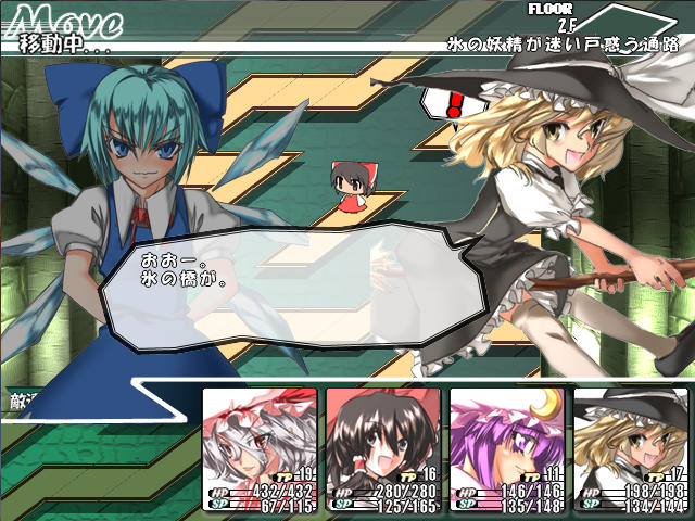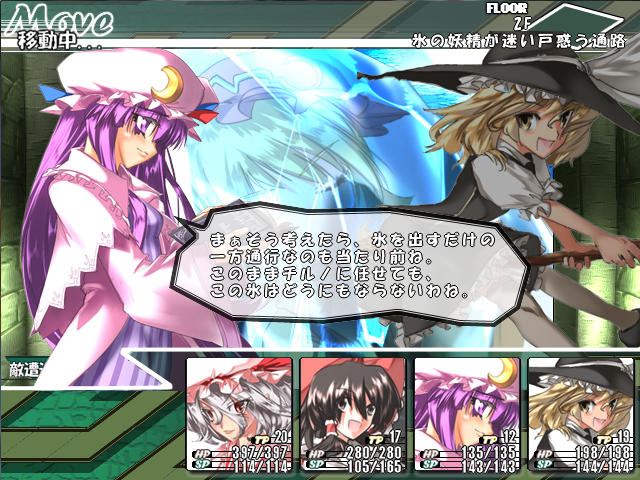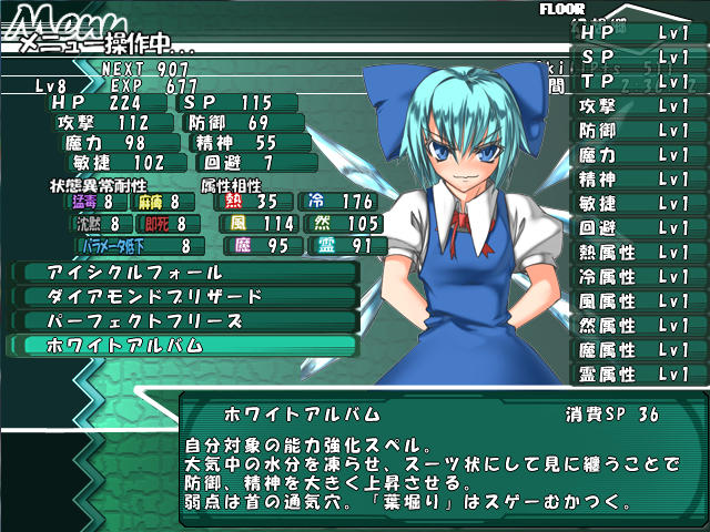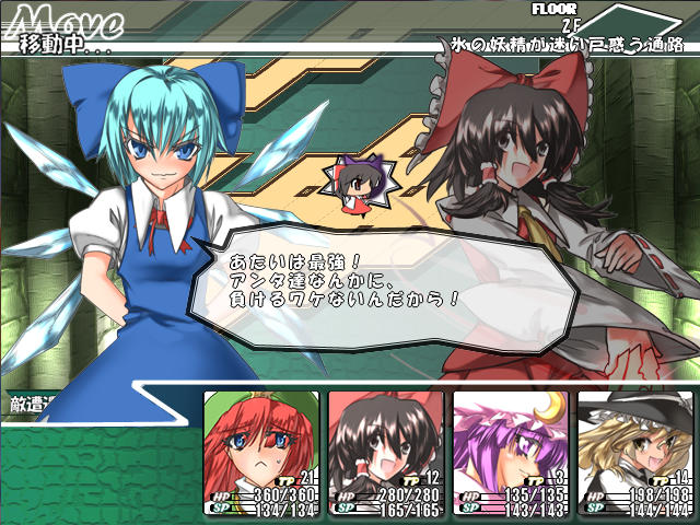 チルノの攻撃力はそんなに高くないんだけど、氷のスペルで敏捷を下げられたり、動きを止められたりで苦戦する。って言うか、こっちも一生懸命攻撃してるのにチルノどんだけHP高いんだよ?これじゃあSPもHPも全然足りねえよ。