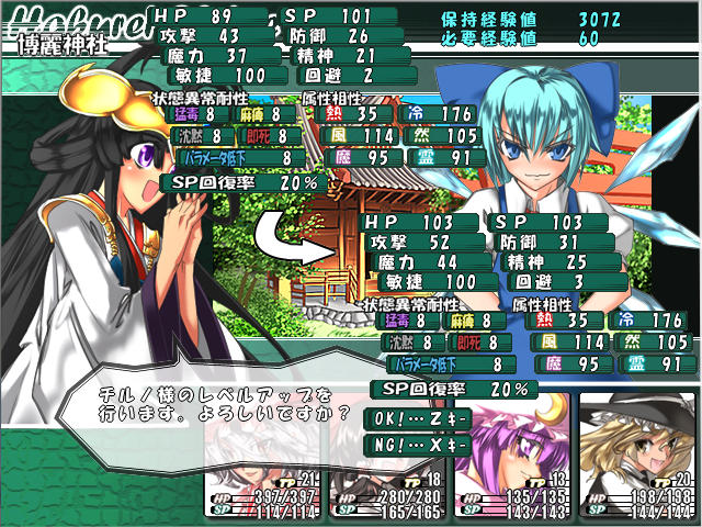 どうにかチルノを倒して仲間にしたところで、初期レベルからレベル上げしてどれだけステータスが伸びるか確かめてみた。