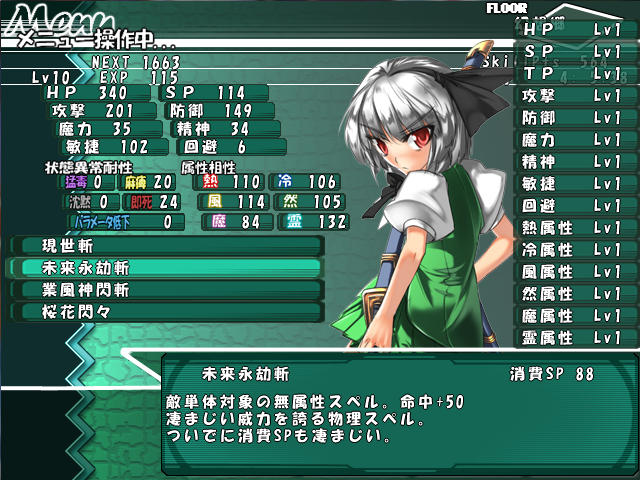 どうすればいいかわからんので攻略サイトを探してみると、意外とすぐに見つかった。それによると妖夢の撃破推奨レベルは11~13LVだそうだ。なるほど、今のパーティのレベルは平均10~11なんだけど、そんなにかからないな。…いや、でも妖夢だいぶ強かったからLV13でも不安だ。だからLV14まで上げることにしよう。できれば次のフロアに行って上げたかったけど、まあ無理ではあるまい。