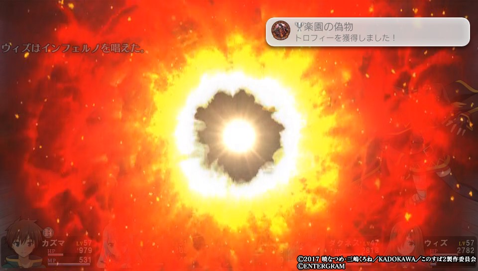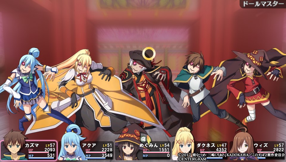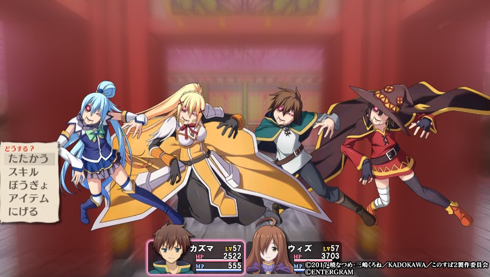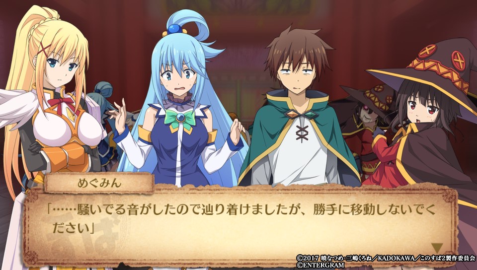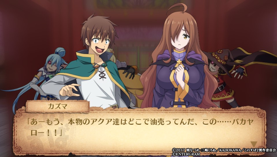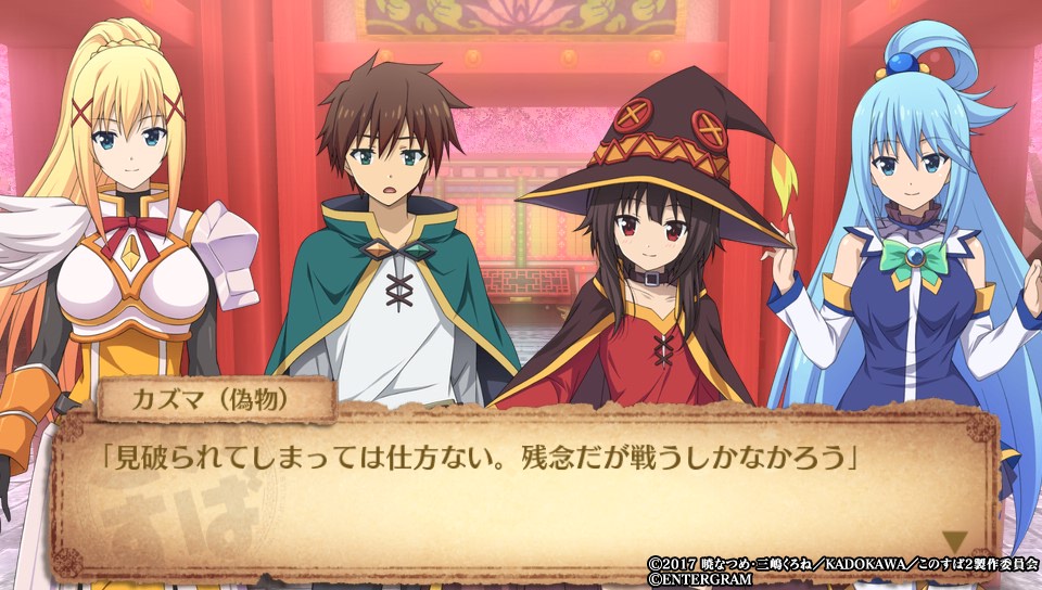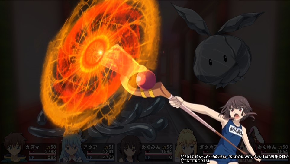 7番目のダンジョン、桃源郷のボス戦ではアクア、めぐみん、ダクネスがパーティから離脱し、カズマを含む人形4体と戦う展開に