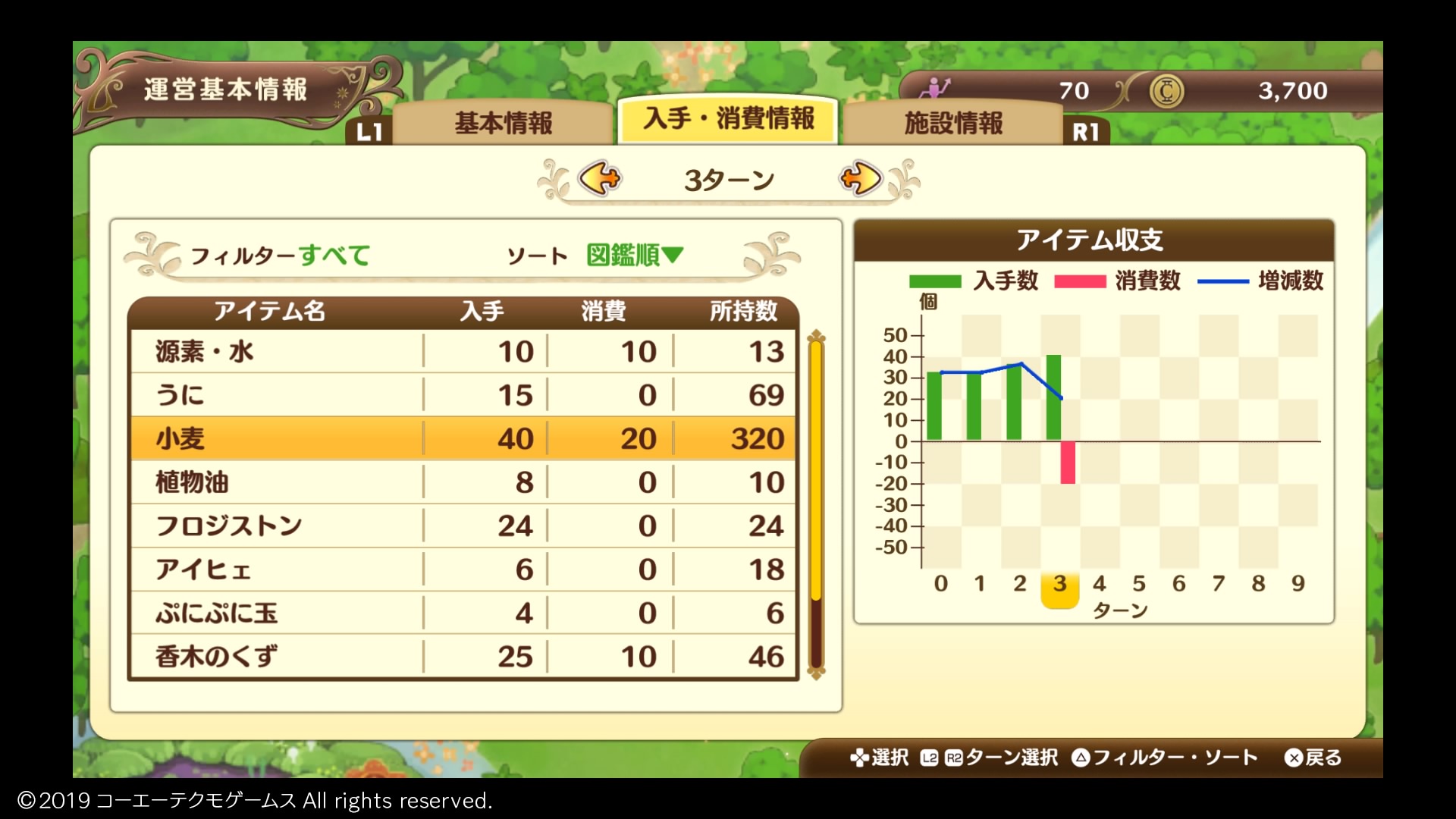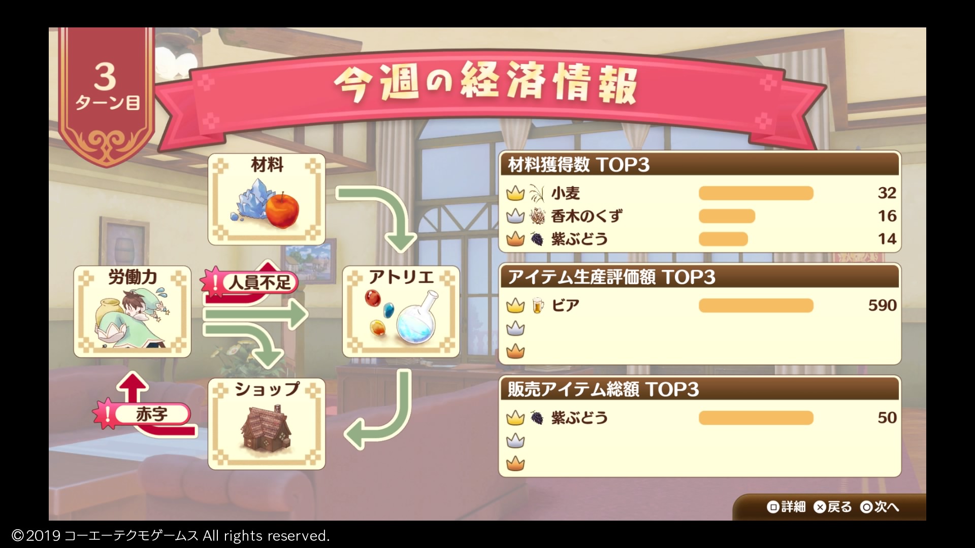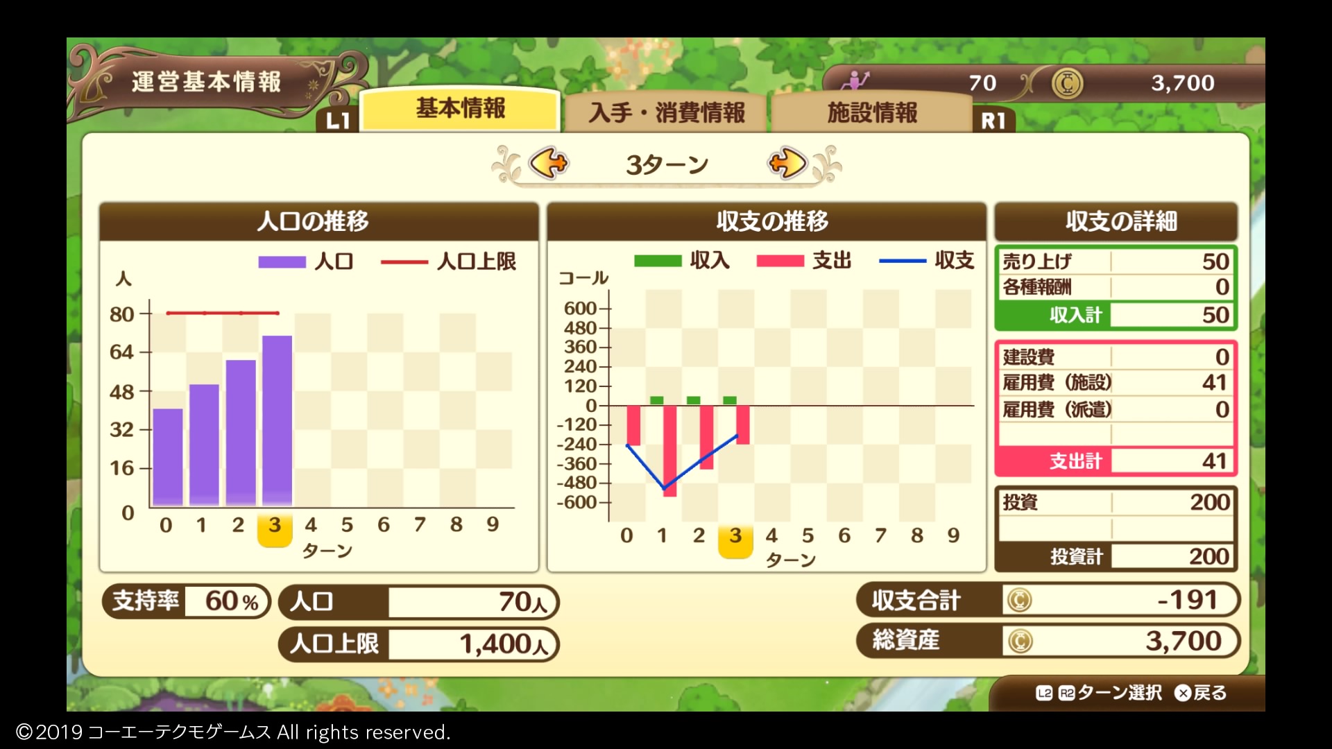 期限までは余裕があるので、まずは街への投資を続けて販売体制を整え、黒字3ターンを目指す期間は投資せずに支出を抑えることにしよう
