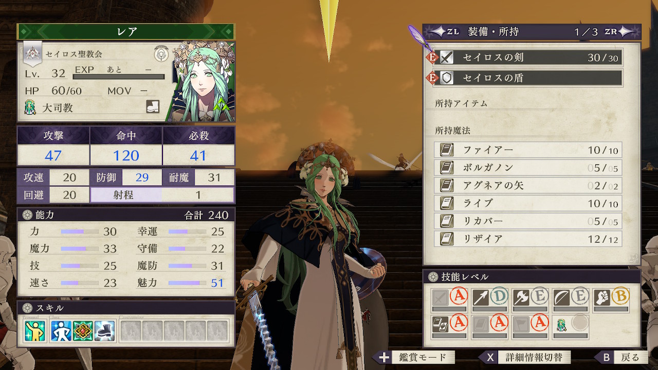 こうすることでセイロスの剣のHP吸収効果を防げるだけでなく、力より魔力の方が低いこと、騎士団効果で魔攻が減少すること、攻速が下がること、そして信仰LV5はついているのに理学LVのスキルをつけ忘れているというドジっ子(?)スキルも発動するなど、あらゆる面でレアの戦闘力を弱体化させられる