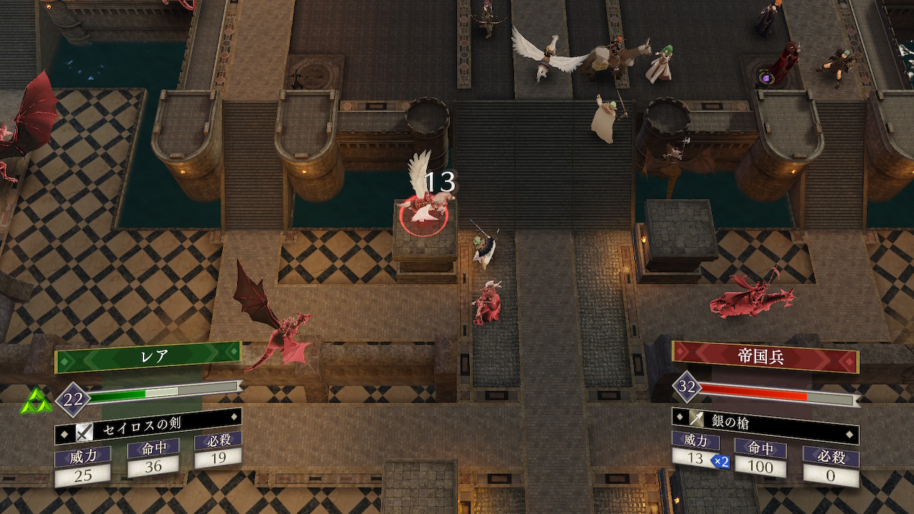 マップ右上まで進軍した状態だと、位置関係的にレアが先陣を切って川に飛び込んでくるので、他の教団兵が合流する前に撤退させられる