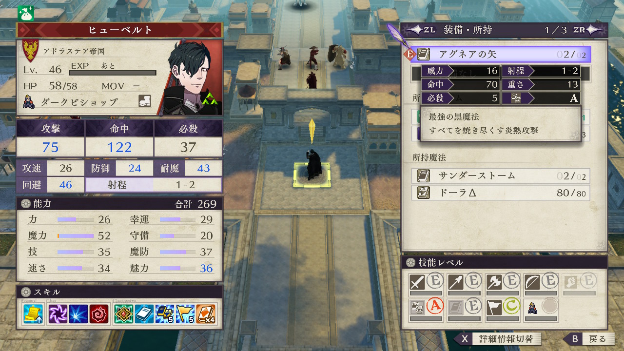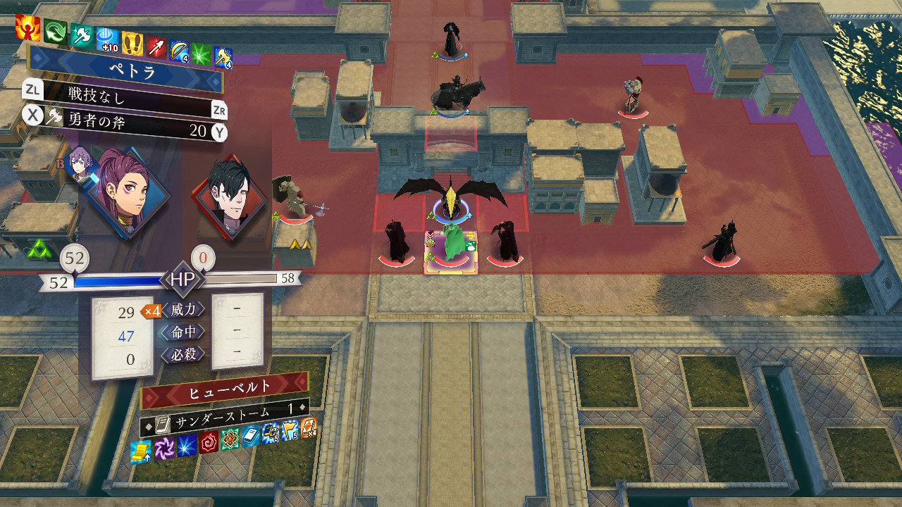 サンダーストームを使わせずに飛行系でヒューベルトを奇襲しようにも、ペトラの外伝時に出現した時と違い今回は初期装備がアグネアの矢なので耐魔の低いユニットで突っ込んでも返り討ちに遭う