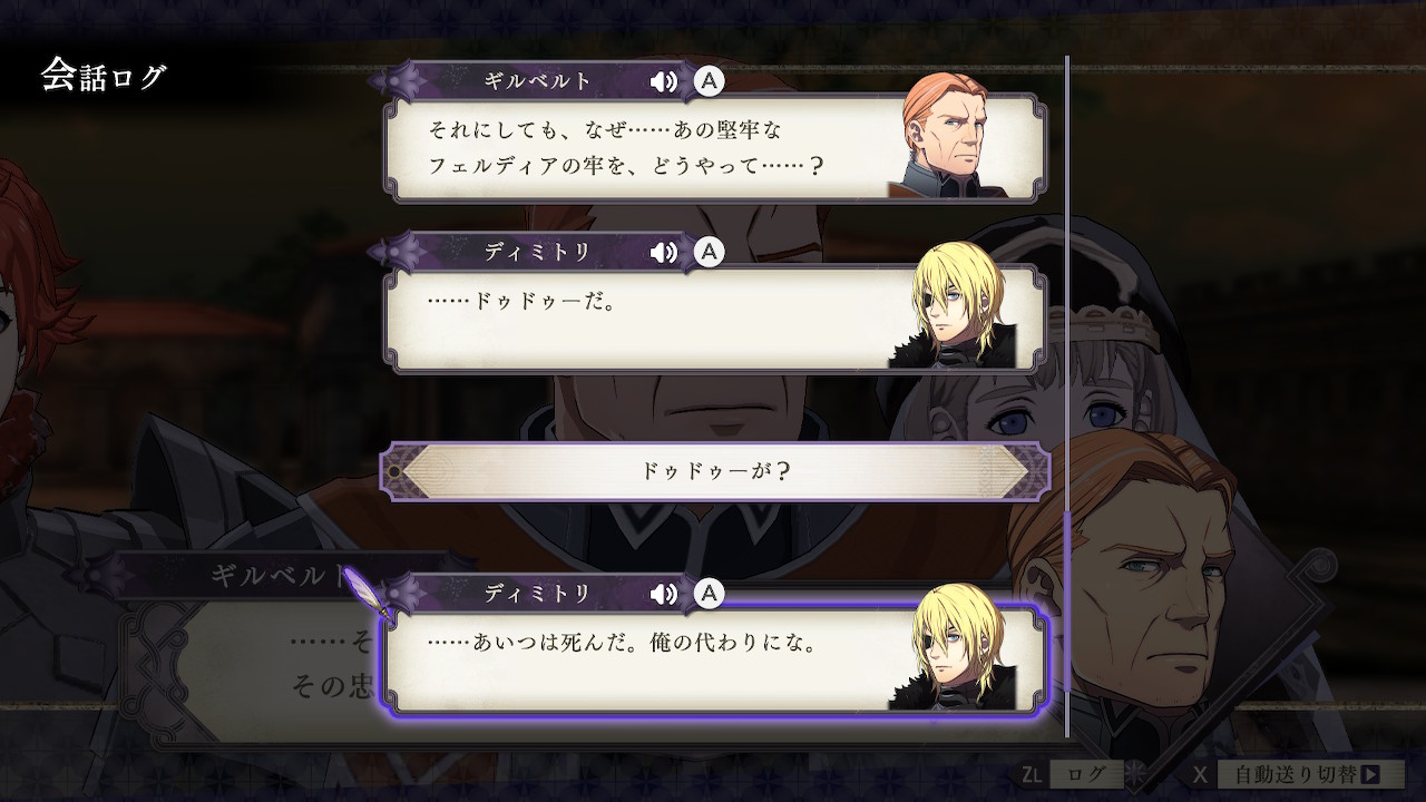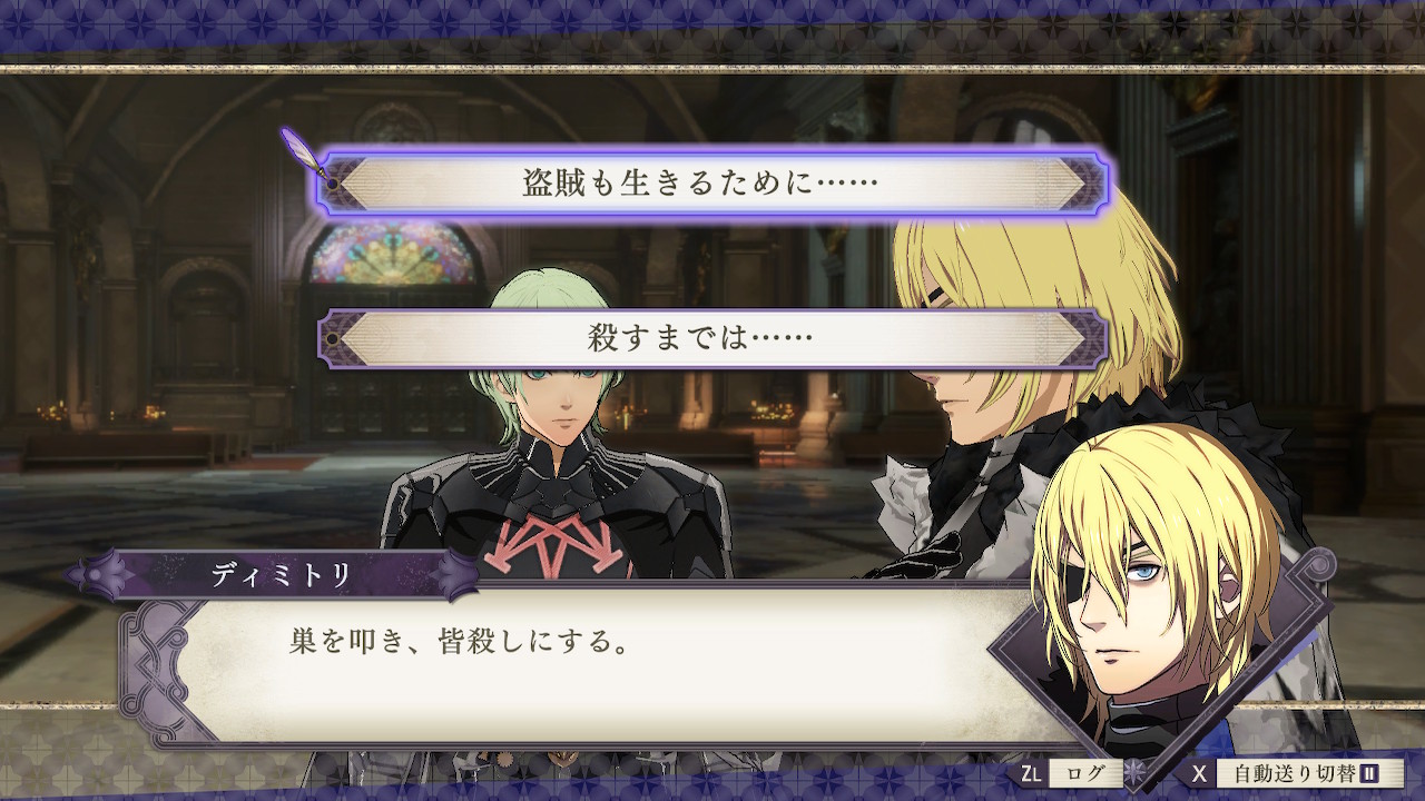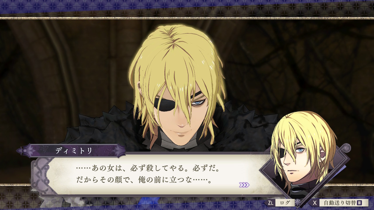 余談だが、このルートでのディミトリは眼帯をつけ、生気を失った亡者のような眼をしているが、紅花の章でディミトリと戦った時は眼帯がなく、まだまともだったことが判明