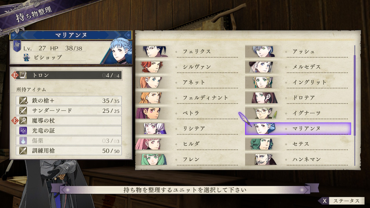 今回は青獅子ルートなので青獅子の生徒は全員主力で使うとして、他学級は金鹿のマリアンヌ、ヒルダ、イグナーツ、あとはフレンを主力にする