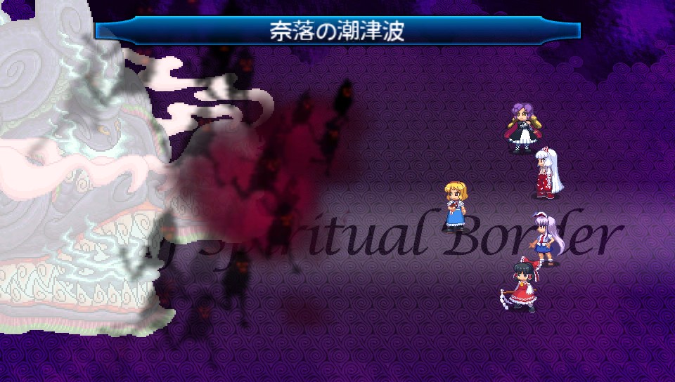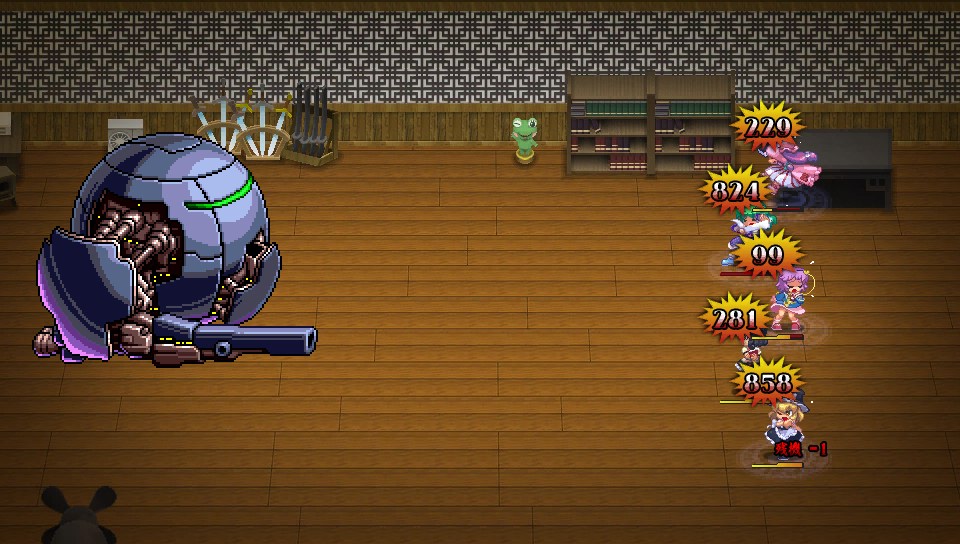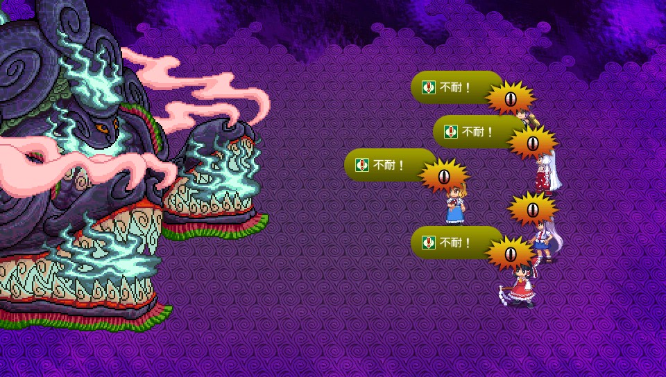 属性耐性や防御を無視してくるためまともに食らうとパーティが全滅する恐れもありますが、アリスのリトルレギオンに霊夢の二重結界(魔法)を乗せたり、にとりのコマンダースペルのカモフラージュでバリアを張ればノーダメージでしのげます