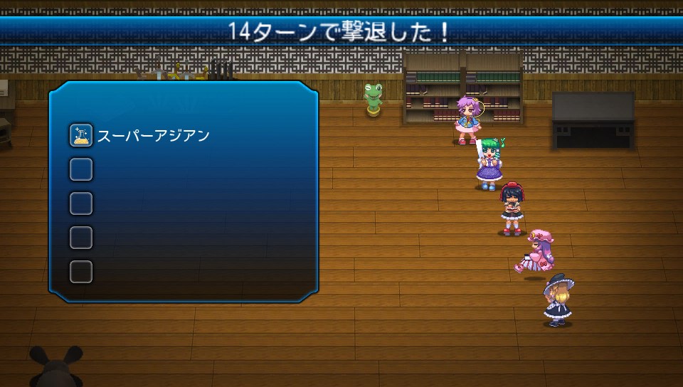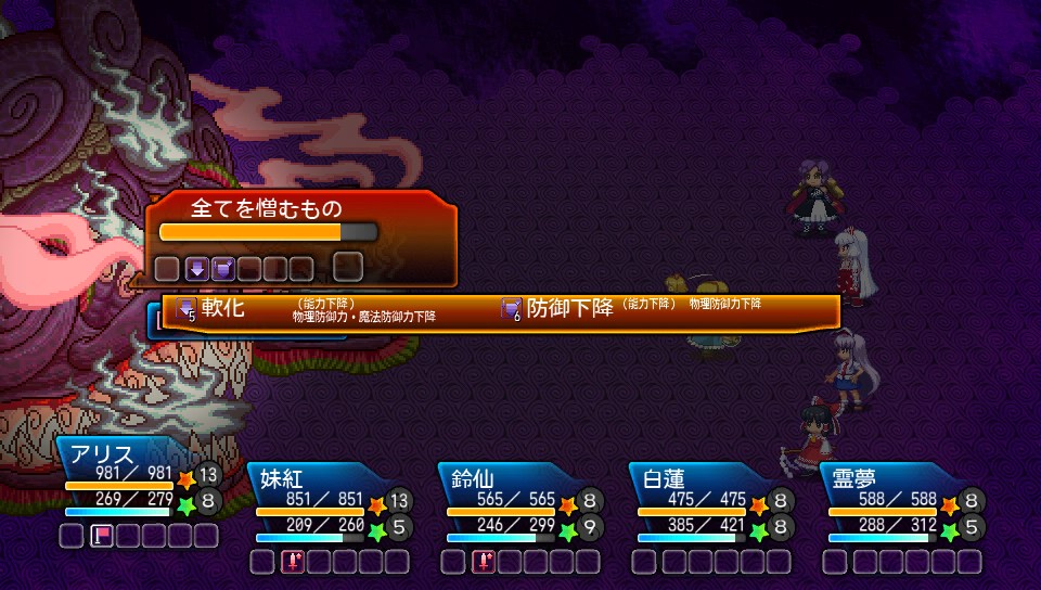 ボスに能力低下が入る確率は非常に低く、私が最初に撃破できた時は一度も成功しませんでしたが、運よく軟化が入ればこちらの与えるダメージが倍増するので、妖夢の待宵などの大技を叩き込めば撃破までのターン数を減らせます