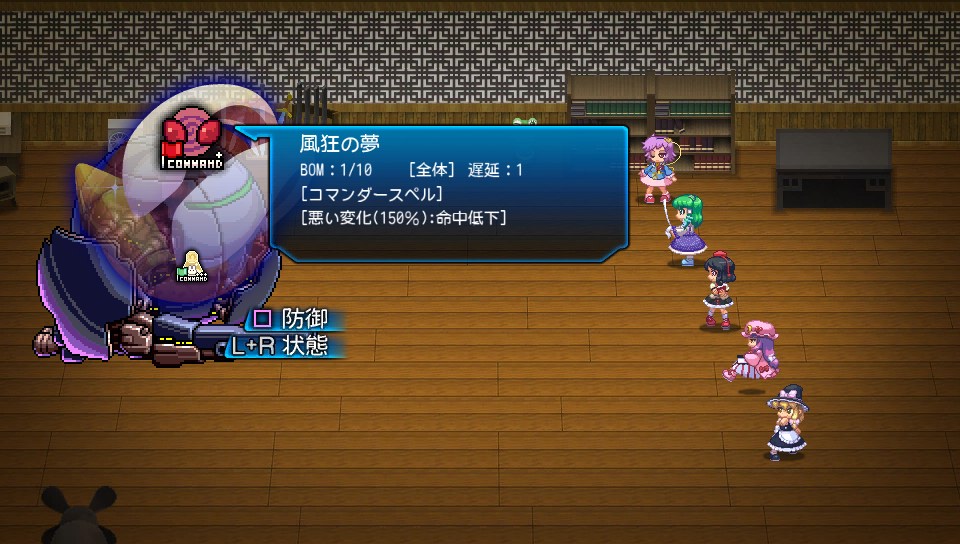 鈴仙のコマンダースペルは遅延が1ターンあるため、ボスにデバフが入って安定してきたら文の葉隠れと交互に使用します
