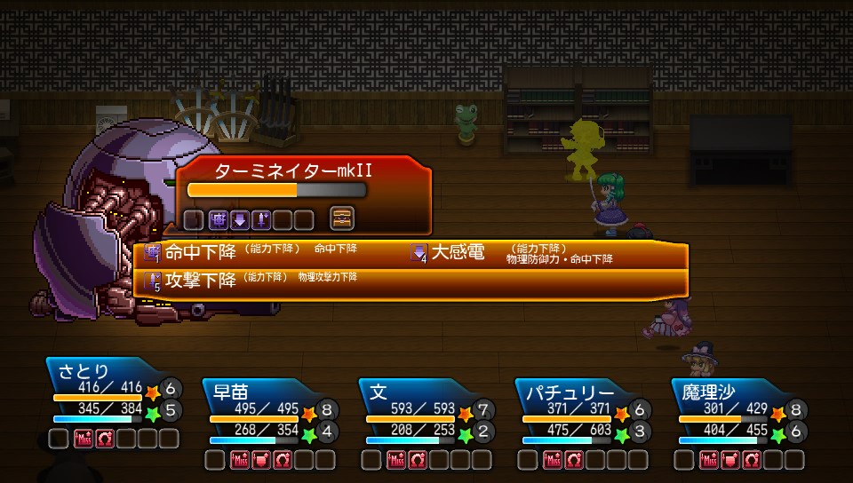 戦闘が始まったらまずさとりでボスに命中低下→攻撃低下を入れます
