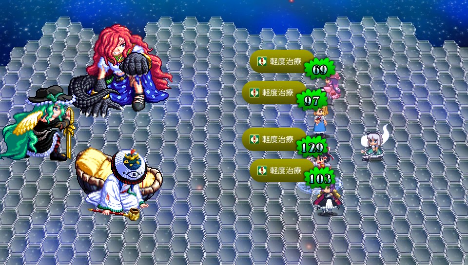 あと、回復は主に霊夢の回復の札を使用してたんですが、回復量が少なくボスの苛烈な攻撃を食らった後だと回復が追い付かないこともあり、その時は白蓮のスペカのディアボリックエナジーで一列をほぼ全回復できたのが頼りになりました
