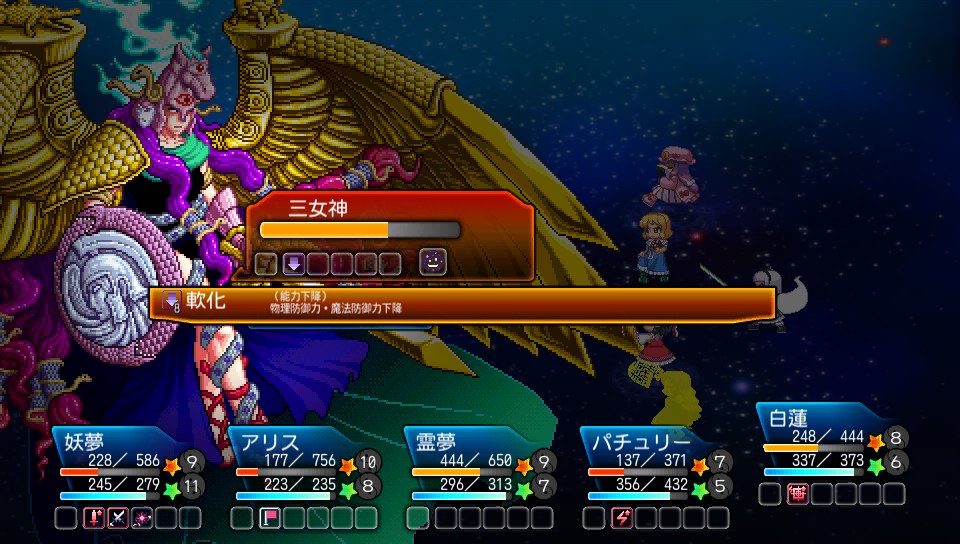 物理アタッカーとして妖夢に草薙の剣を装備させ、そこに白蓮で属性を付与してやれば、ほとんどの敵の弱点をつけます