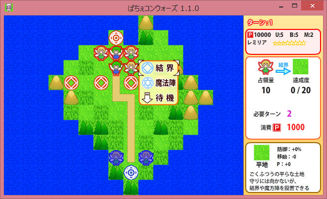 結界が多いほどターン開始時のPの回復量が増加し、魔方陣からPを消費して強力なユニットを召喚、そして敵を倒すというのが大まかな流れだ