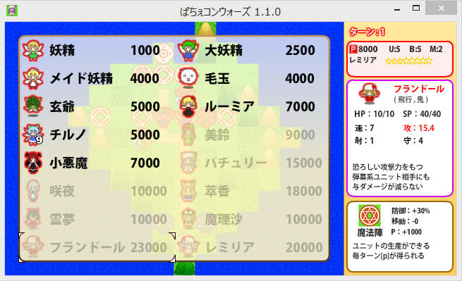 そのため、こちらは弾幕系や飛行系ユニットを量産して手数を増やし、初期配置の敵軍を全滅させれば割と簡単にクリアできる