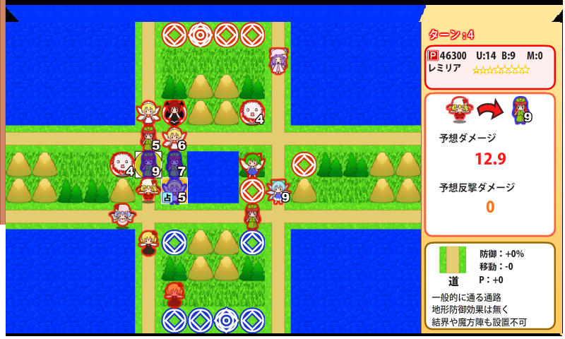 最初から自軍に配置されているレミリアと魔理沙を使えば橙に近づかれる前に先制攻撃が可能だが、単騎で突出させると後続の敵ユニットに狙われる可能性が高まるので、敵の攻撃範囲には十分注意しよう