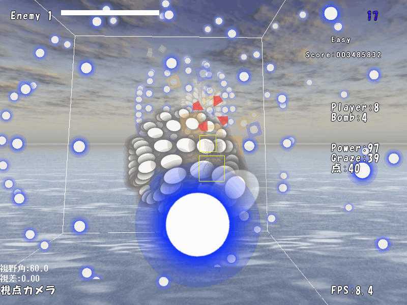 3Dだと上下左右に加えて前後という奥行きの概念もあるため、十字キー以外のキーで奥行き方向の操作も行うことになるんですが、難易度が低いうちは上下左右の移動のみで全ての弾幕を避けられるようになっています