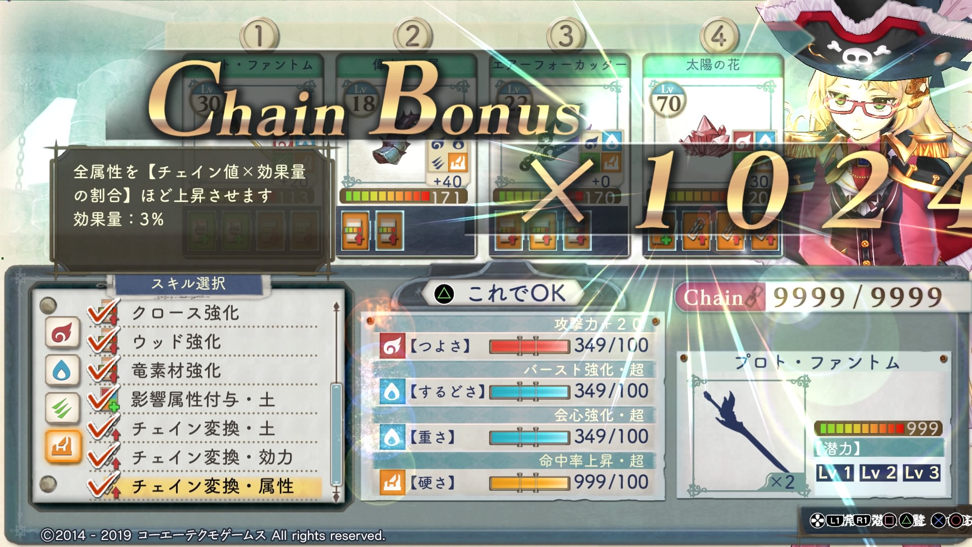 これによりどうなるかというと、調合スキルによってチェインを9999まで上げ、それを土属性のスキルで効力に変換することで、効力999のアイテムが作成できるようになります
