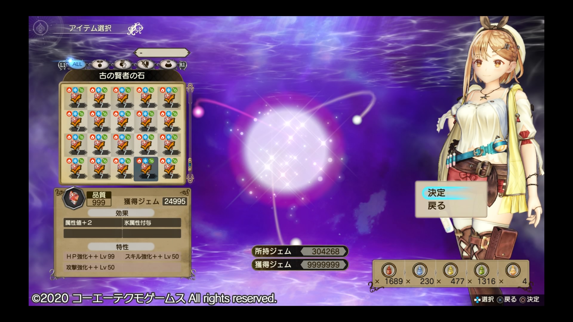 他の素材は一切必要ないためアトリエの外に出ることなくジェムの無限生成が可能となり、量産開始から10分とかからずジェムをカンスト(999万9999)させることができました