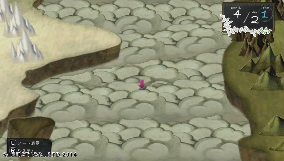 アバンタイトルで冒険の幕が上がった後、ワールドマップでアトリエからふもとの町まで移動することになりますが、町まで3日かかるとは、距離ありますねえ(;・∀・)