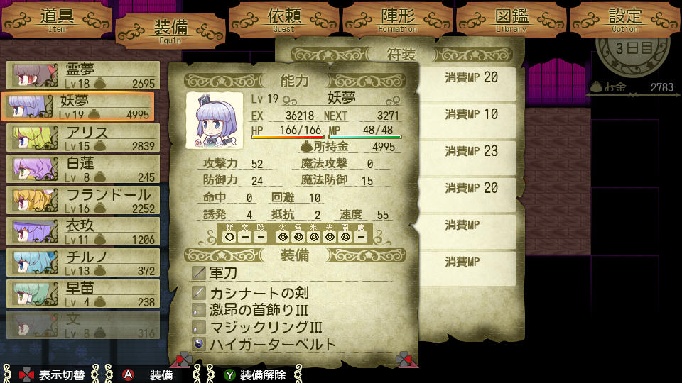 妖夢はスペカの火力が高いけど燃費が悪すぎるので、修羅剣の構えで攻撃力を上げながらひたすら通常攻撃を繰り返すことになりそう