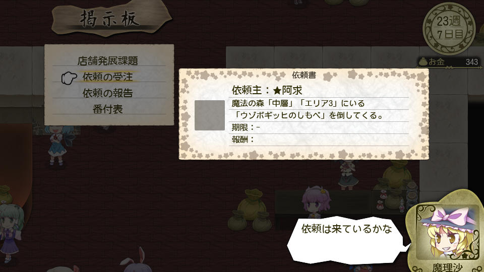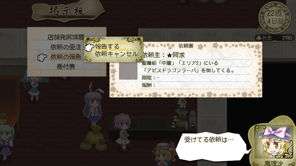 異変発生中は他の依頼を消化して資金を稼ぐことができないので、錬金したアイテムを陳列棚に並べて売却して稼ぐ必要があります