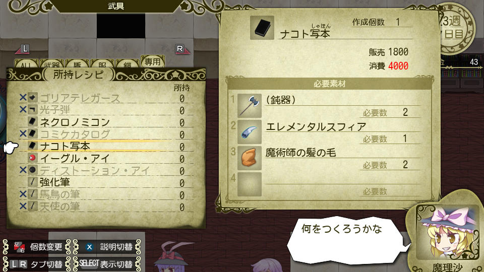 本当はもう1ランク上の専用装備を作成、購入させたいんだけど、専用装備の作成には敵がドロップする素材が必要で、どこでどの敵を倒せばドロップするのかわからないのが辛いところ