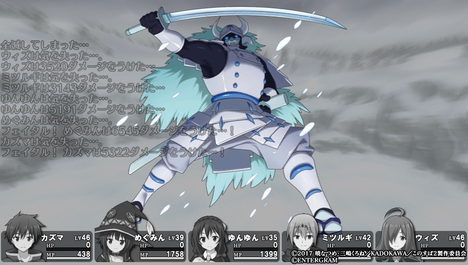 そしてラスボス戦は編成に縛りがなく好きなキャラでパーティが組めるので、使えない初期メンバーを入れ替えて火力重視の編成にしようかと思ったが、アクアは前述のように全体回復役として必要だし、ダクネスはアクアが麻痺しないようかばってやる必要がある