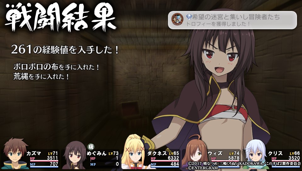 めぐみんのLV上げ以外にも爆裂魔法が弱点のザコ敵に使ったり、かしこさが上昇する装備を揃えるなどダメージ値を上げる方法はいくつかあるらしいので、他にもトロフィー条件になっている未討伐のボスを倒したりしながら、最終的にめぐみんのトロフィーを取ってトロコンできるよう、もうちょっと1周目のデータをやりこんでみることにします