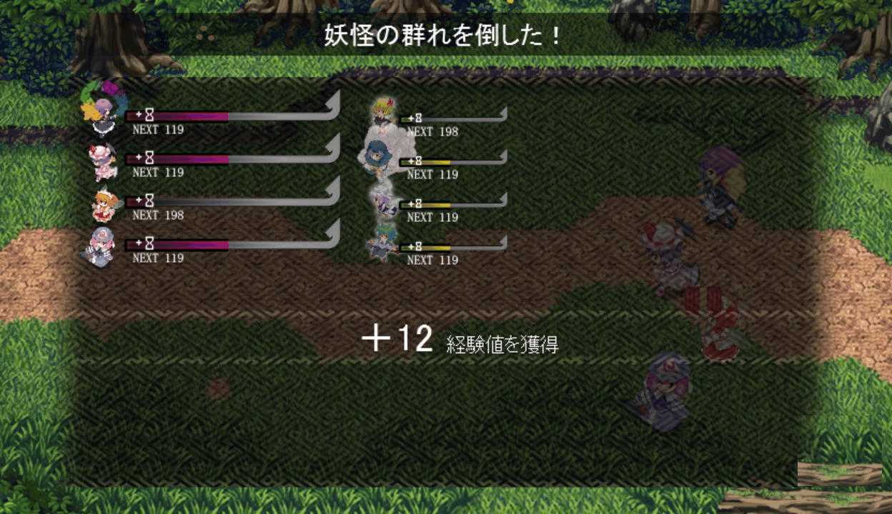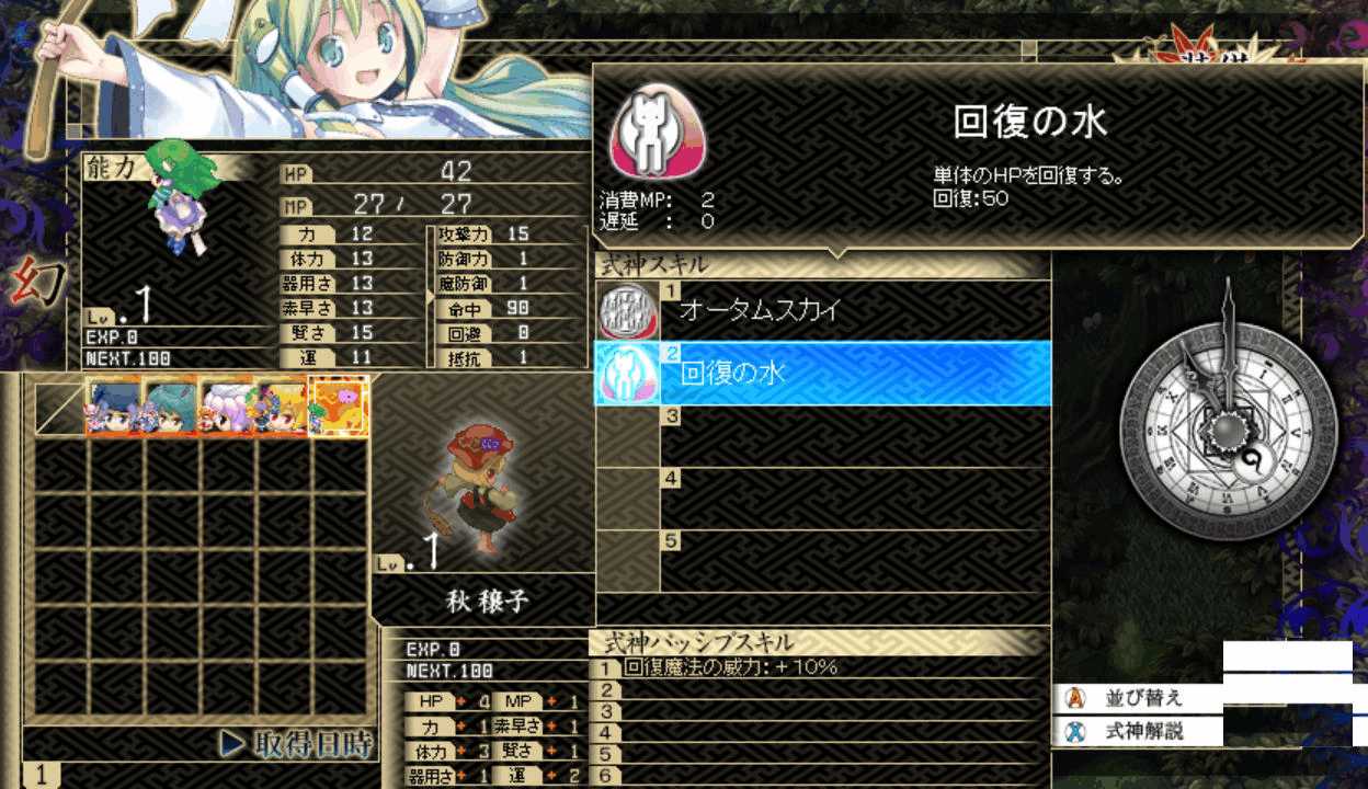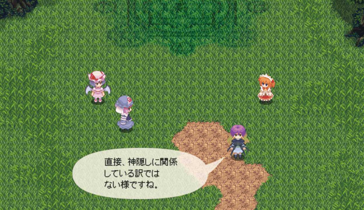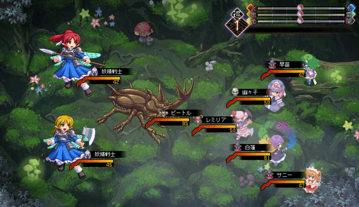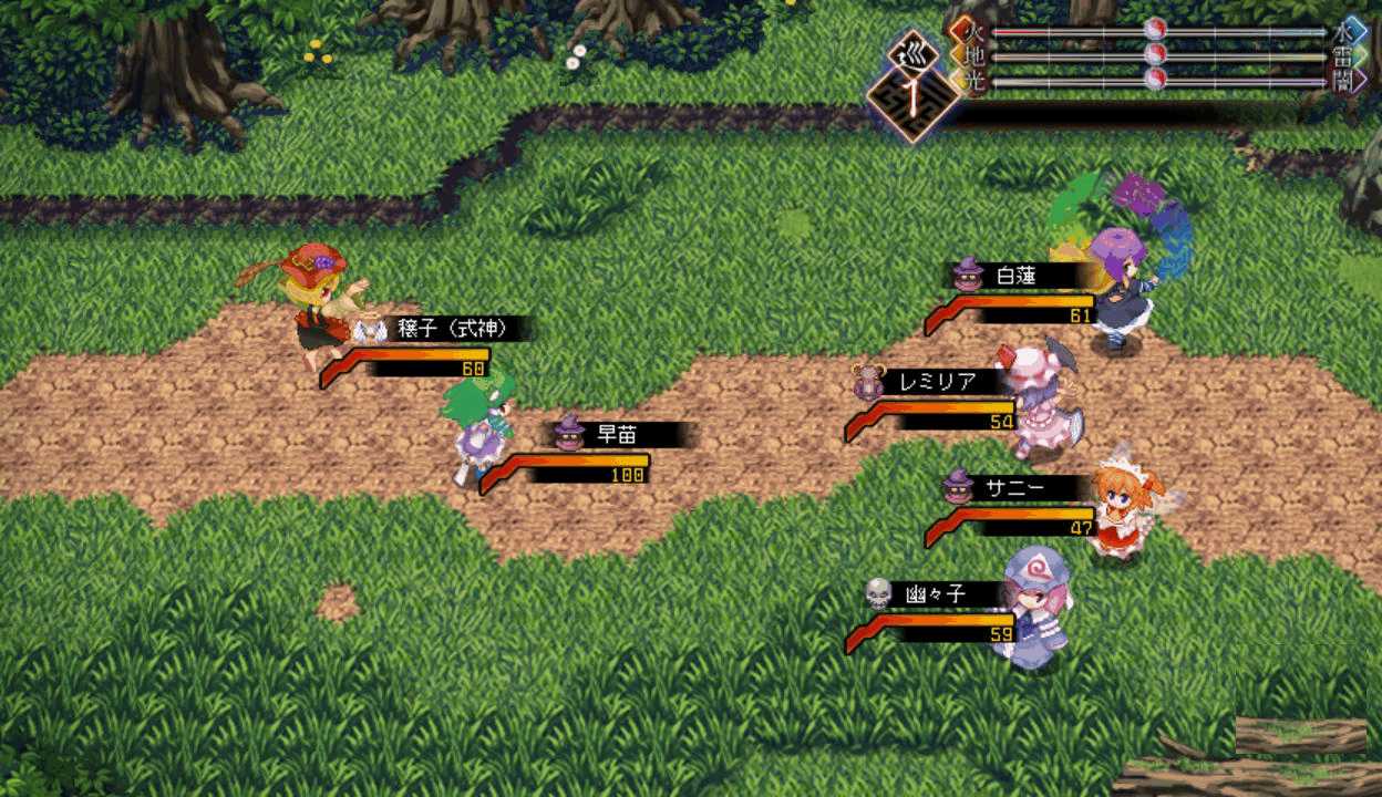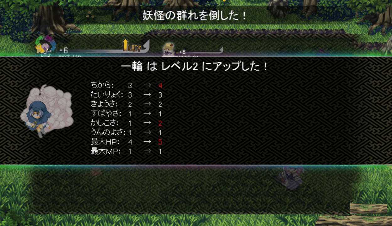 今度は最後までレティのアイスチルで攻撃できたので撃破できたここで初めてPボタンを押すとなんと地図が表示された!しかも場所を選択すると瞬間移動が出来る!この便利機能もっと早く知りたかった!主人や式神のLVが上がるともらえる経験値が減る 前作と同じ仕様だね早苗と穣子と遭遇 すぐに仲間になってくれるのかと思いきや…やっぱりいつもの誤解がorz ボスマークあったからそんな気はしたけど強さは最初のサニー&ルーミアと同じ これなら瞬殺できちゃうだろはい2ターン目で楽勝撃破こっちも仲間が増えるのは心強いです仲間が5人になったので多数の陣形が選択可能になった!早苗は貴重な回復スキルを持つ穣子を連れていた これで回復手段確保だ新しいエリアの魔法の森へエリアが変わり急に敵が強くなったちょっ、物理攻撃が効かないだと!?ここは魔法で攻撃しよう魔法の森のマップは意外なところが歩けてしまうので探検気分を楽しめる 正直すごいマッピング技術