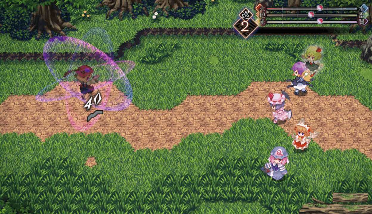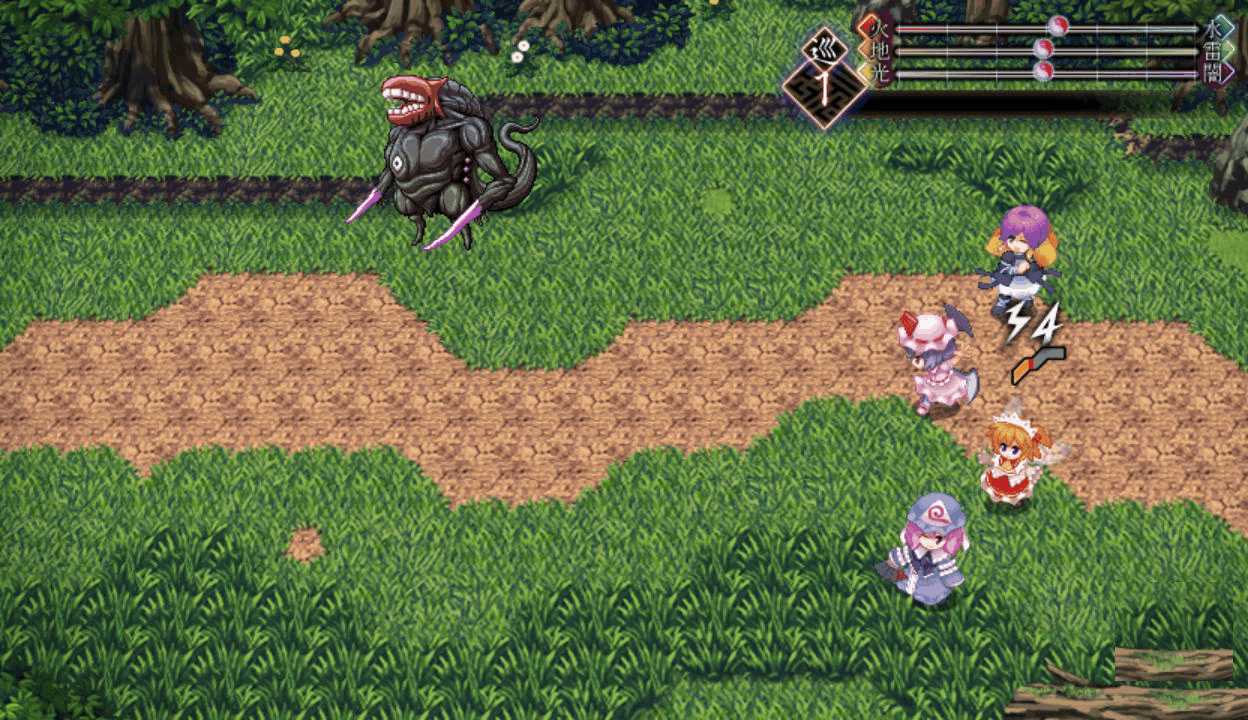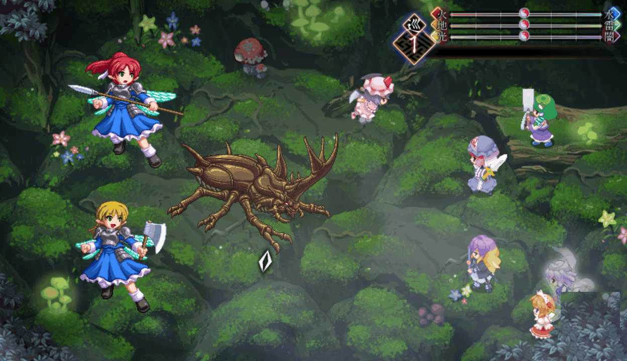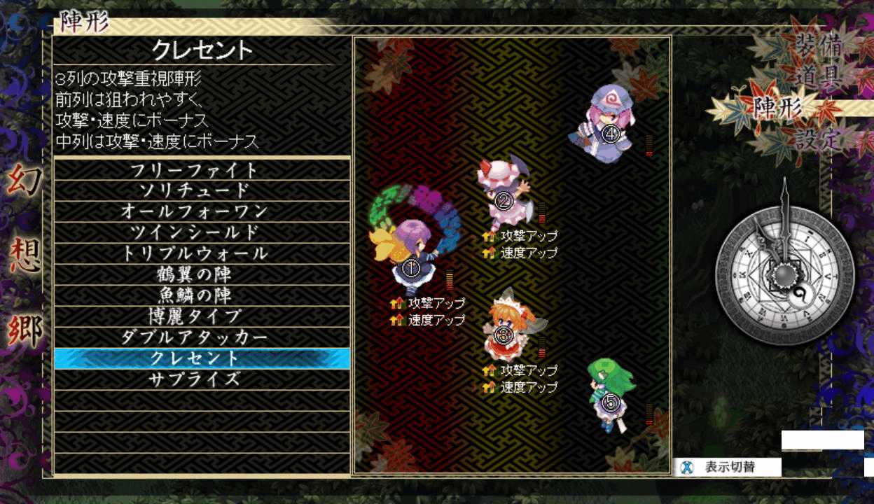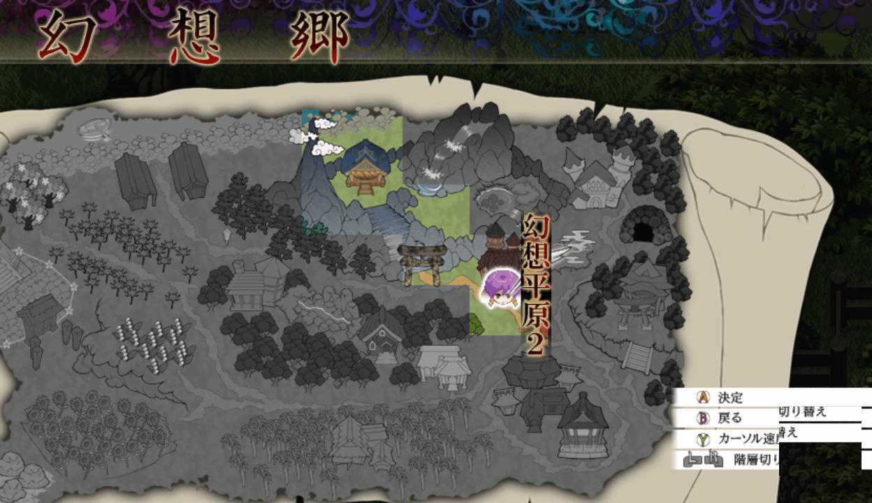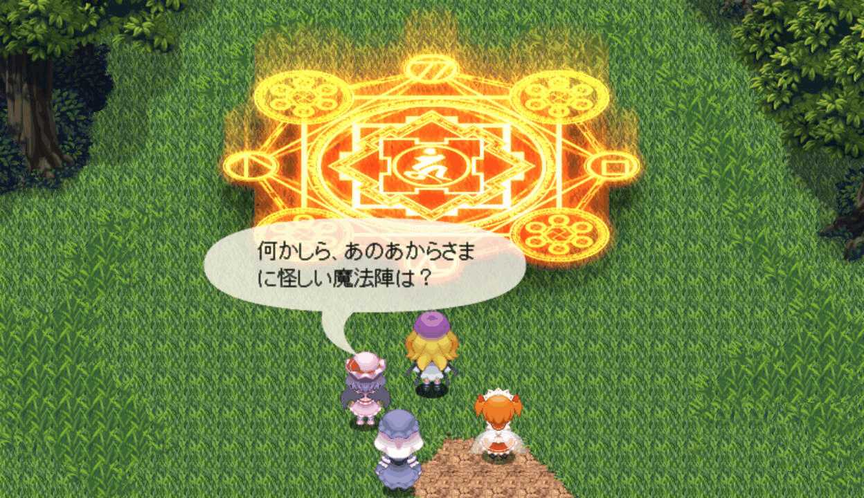 今度は最後までレティのアイスチルで攻撃できたので撃破できたここで初めてPボタンを押すとなんと地図が表示された!しかも場所を選択すると瞬間移動が出来る!この便利機能もっと早く知りたかった!主人や式神のLVが上がるともらえる経験値が減る 前作と同じ仕様だね早苗と穣子と遭遇 すぐに仲間になってくれるのかと思いきや…やっぱりいつもの誤解がorz ボスマークあったからそんな気はしたけど強さは最初のサニー&ルーミアと同じ これなら瞬殺できちゃうだろはい2ターン目で楽勝撃破こっちも仲間が増えるのは心強いです仲間が5人になったので多数の陣形が選択可能になった!早苗は貴重な回復スキルを持つ穣子を連れていた これで回復手段確保だ新しいエリアの魔法の森へエリアが変わり急に敵が強くなったちょっ、物理攻撃が効かないだと!?ここは魔法で攻撃しよう魔法の森のマップは意外なところが歩けてしまうので探検気分を楽しめる 正直すごいマッピング技術