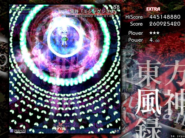 蛇のような動きで配置されるカエル弾が炸裂する前に、蛇の体を横切るようにして配置弾をくぐった後、炸裂弾から逃げるように諏訪子を中心として円を描くように避けるというテクニカルなスペル。