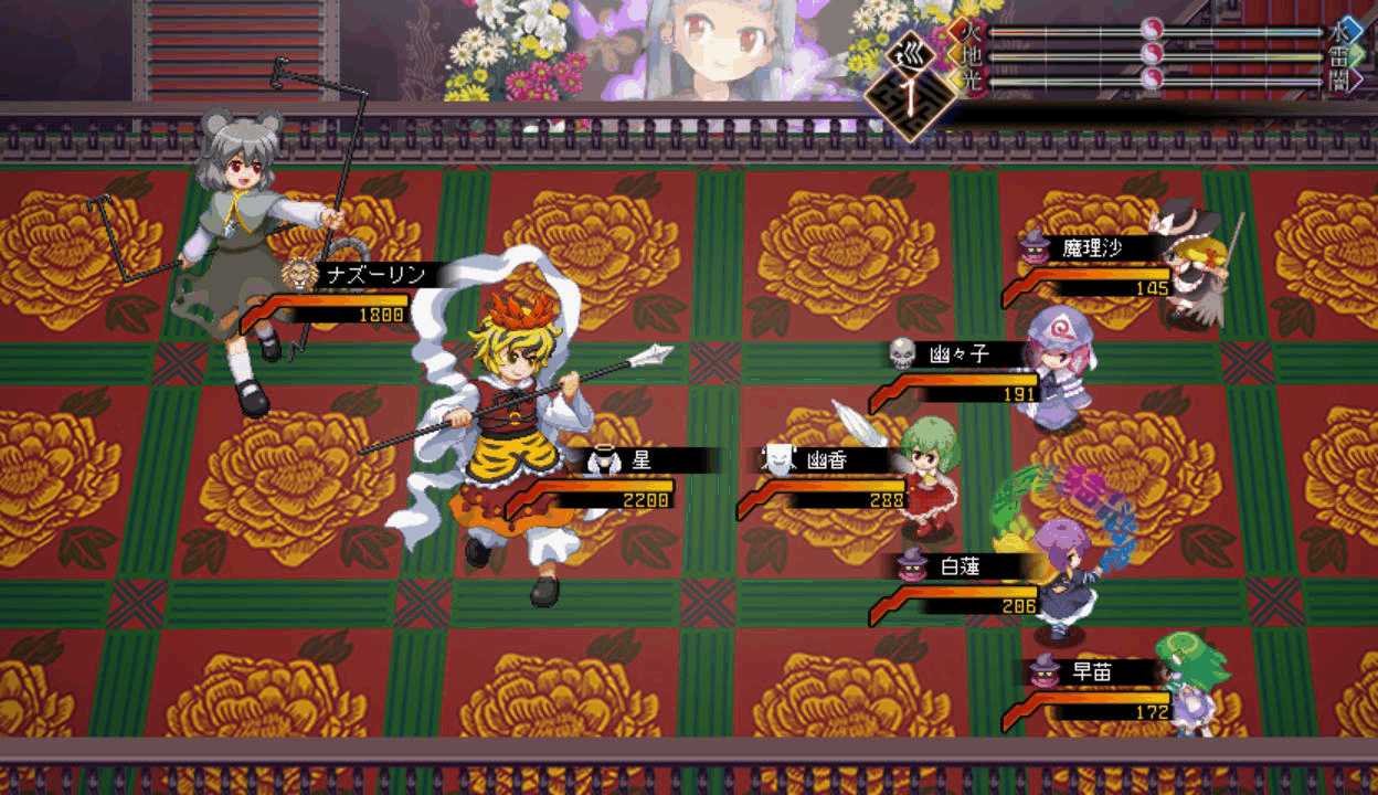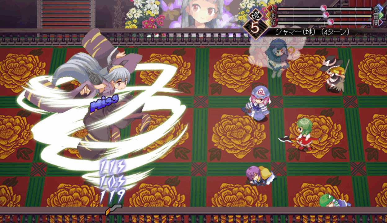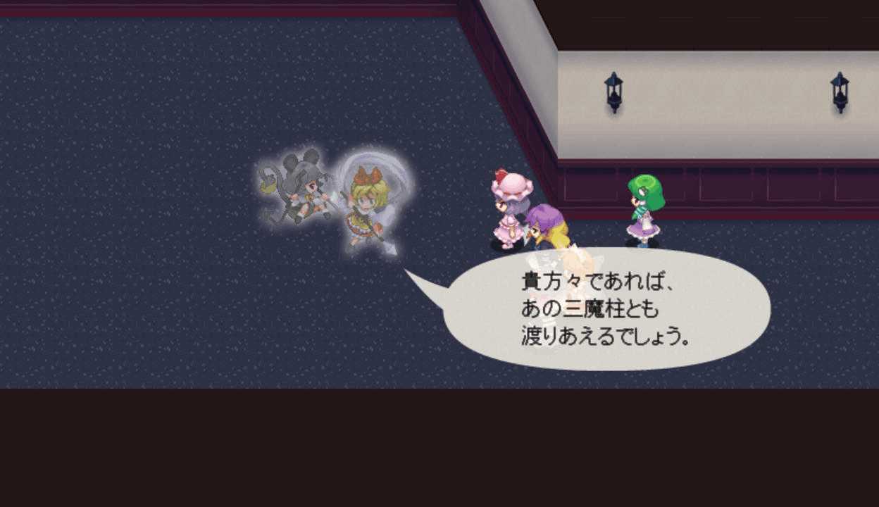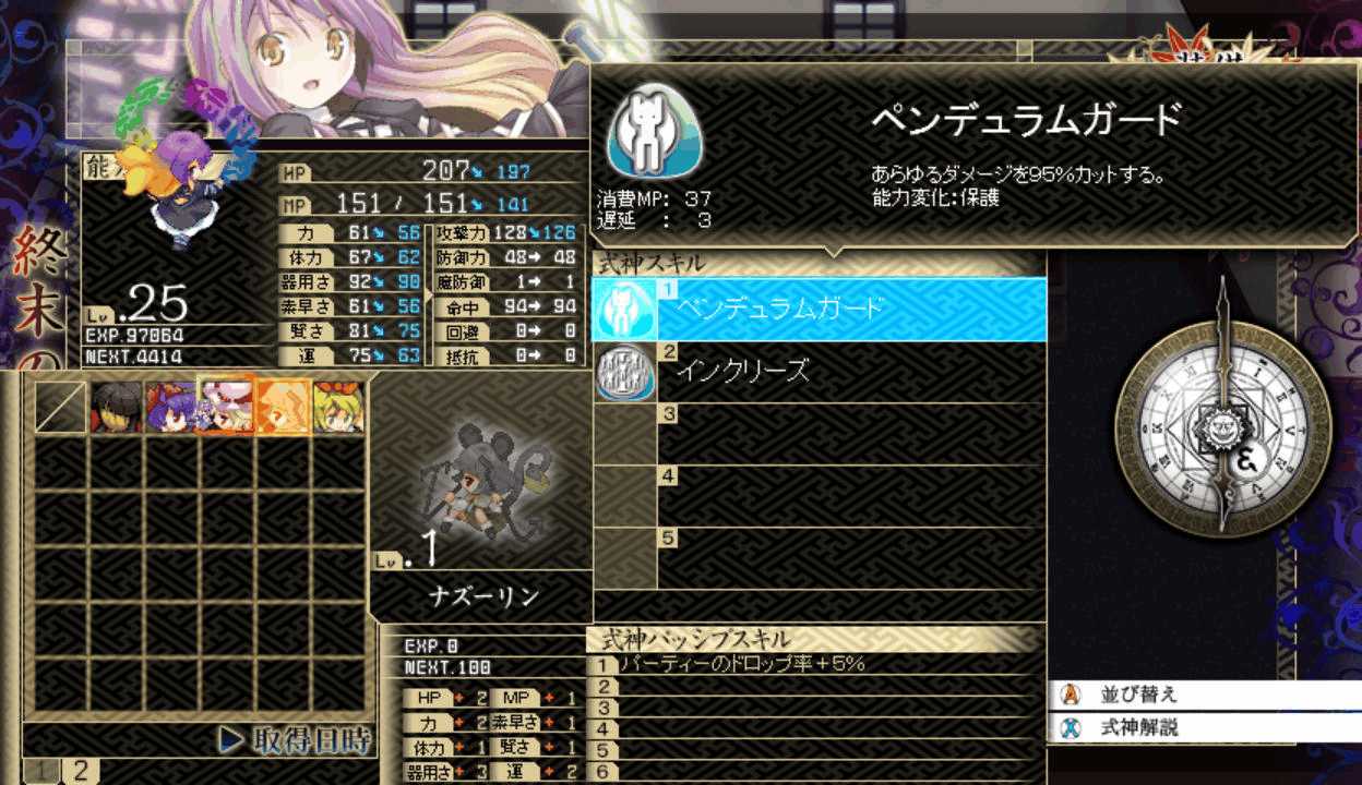 第参の塔攻略中、一度もエンカウントせずにボス戦に!?あまりにも早すぎるので中ボス戦かな?なんと星&ナズーリン!戦う必要ないんじゃないかな~どうでもいいけど背景の肖像画にビビったちょっ、なにこれ!?星の攻撃力高すぎ!ナズーリンの補助によりダメージがほとんど入らない状態にダメージ軽減のせいで時間かかったけどどうにか撃破ナズーリンはスキルよりパッシブスキルに注目お、光属性のチェイスだ これは使えそうセイント・チェイス使ってみたらメチャクチャつえーー!!もうザコ戦はこればっかりでよくない?三魔柱「音羽」出現グラから察するに雷属性が得意そうだ音羽の弱点である地属性の耐性を上げるフィールドを張られた 地属性以外で攻撃せざるを得ない音羽は物理攻撃全般を弱点に持つ 魔法よりもとにかく物理攻撃だくおおーーお互いに瀕死の状態!行けるか?ファルコンスラッシュの先制攻撃で華麗に撃破!残るは第一層の三魔柱だそれにしてもどの層も真ん中の黒い部分が埋まらない 何があるんだろう?
