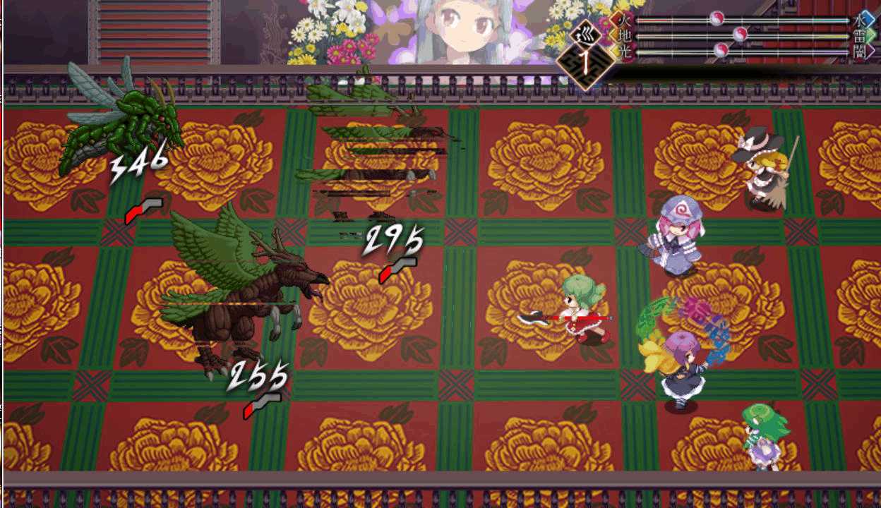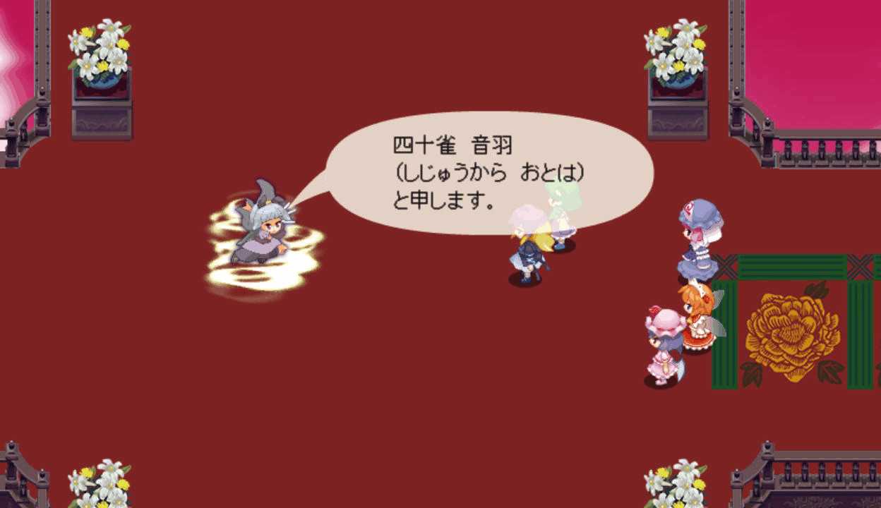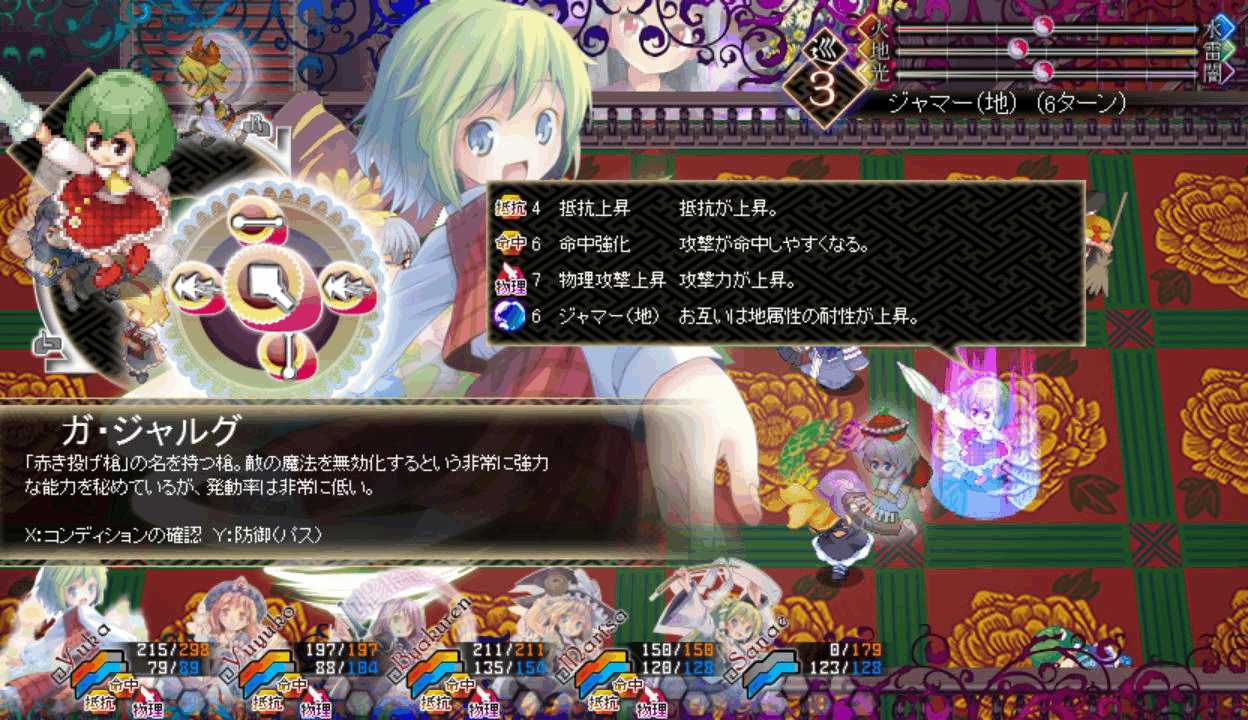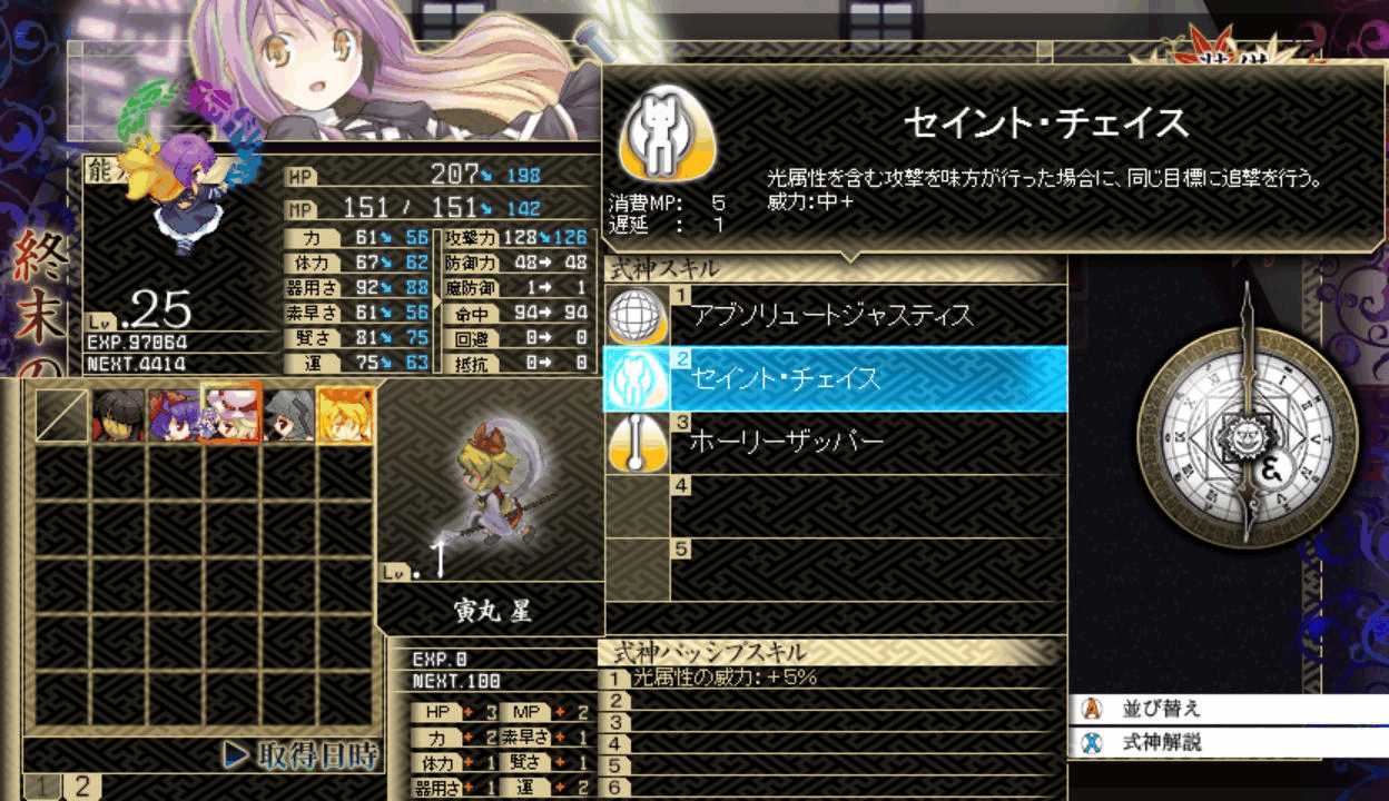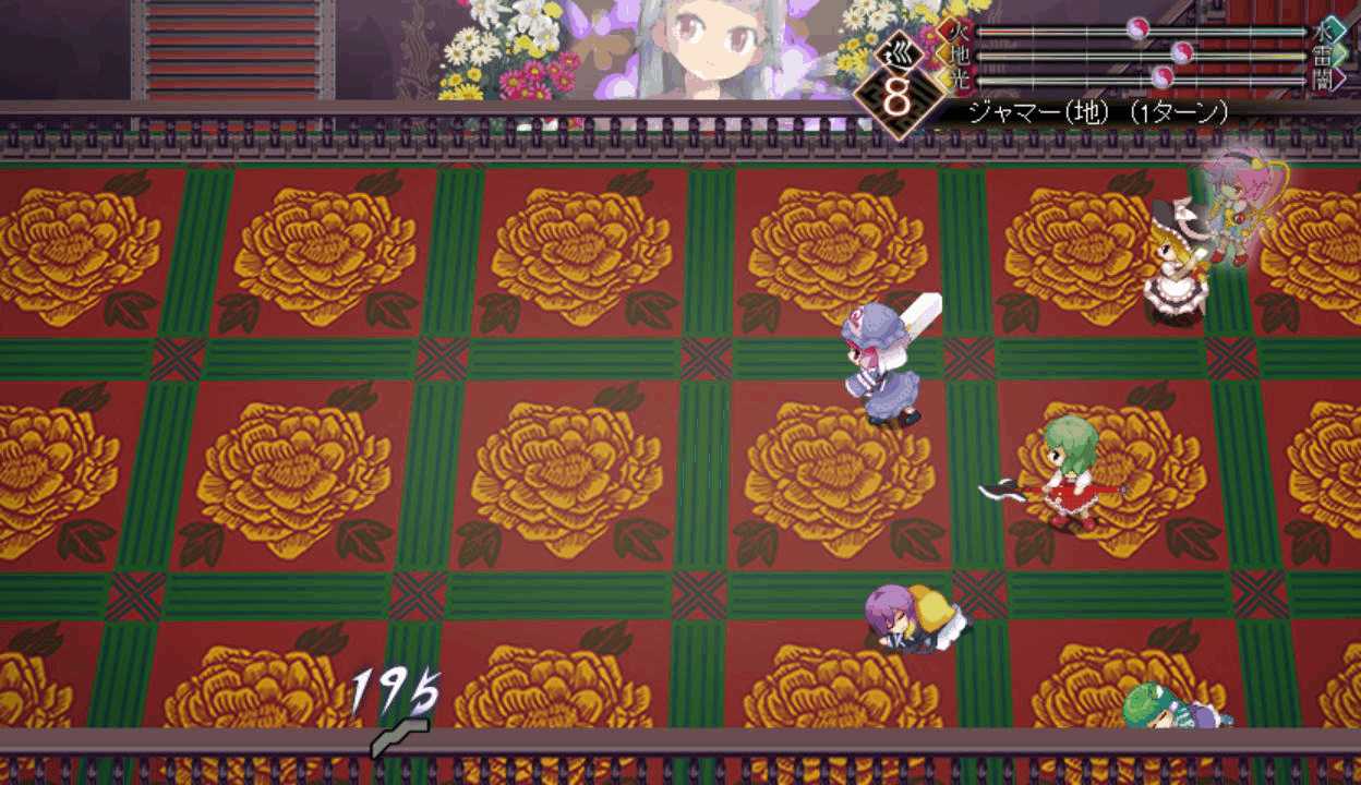 第参の塔攻略中、一度もエンカウントせずにボス戦に!?あまりにも早すぎるので中ボス戦かな?なんと星&ナズーリン!戦う必要ないんじゃないかな~どうでもいいけど背景の肖像画にビビったちょっ、なにこれ!?星の攻撃力高すぎ!ナズーリンの補助によりダメージがほとんど入らない状態にダメージ軽減のせいで時間かかったけどどうにか撃破ナズーリンはスキルよりパッシブスキルに注目お、光属性のチェイスだ これは使えそうセイント・チェイス使ってみたらメチャクチャつえーー!!もうザコ戦はこればっかりでよくない?三魔柱「音羽」出現グラから察するに雷属性が得意そうだ音羽の弱点である地属性の耐性を上げるフィールドを張られた 地属性以外で攻撃せざるを得ない音羽は物理攻撃全般を弱点に持つ 魔法よりもとにかく物理攻撃だくおおーーお互いに瀕死の状態!行けるか?ファルコンスラッシュの先制攻撃で華麗に撃破!残るは第一層の三魔柱だそれにしてもどの層も真ん中の黒い部分が埋まらない 何があるんだろう?