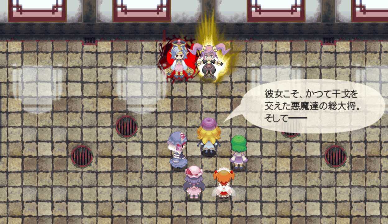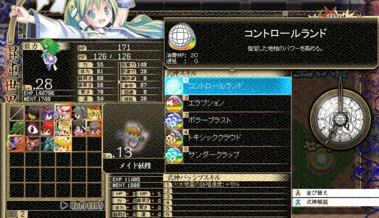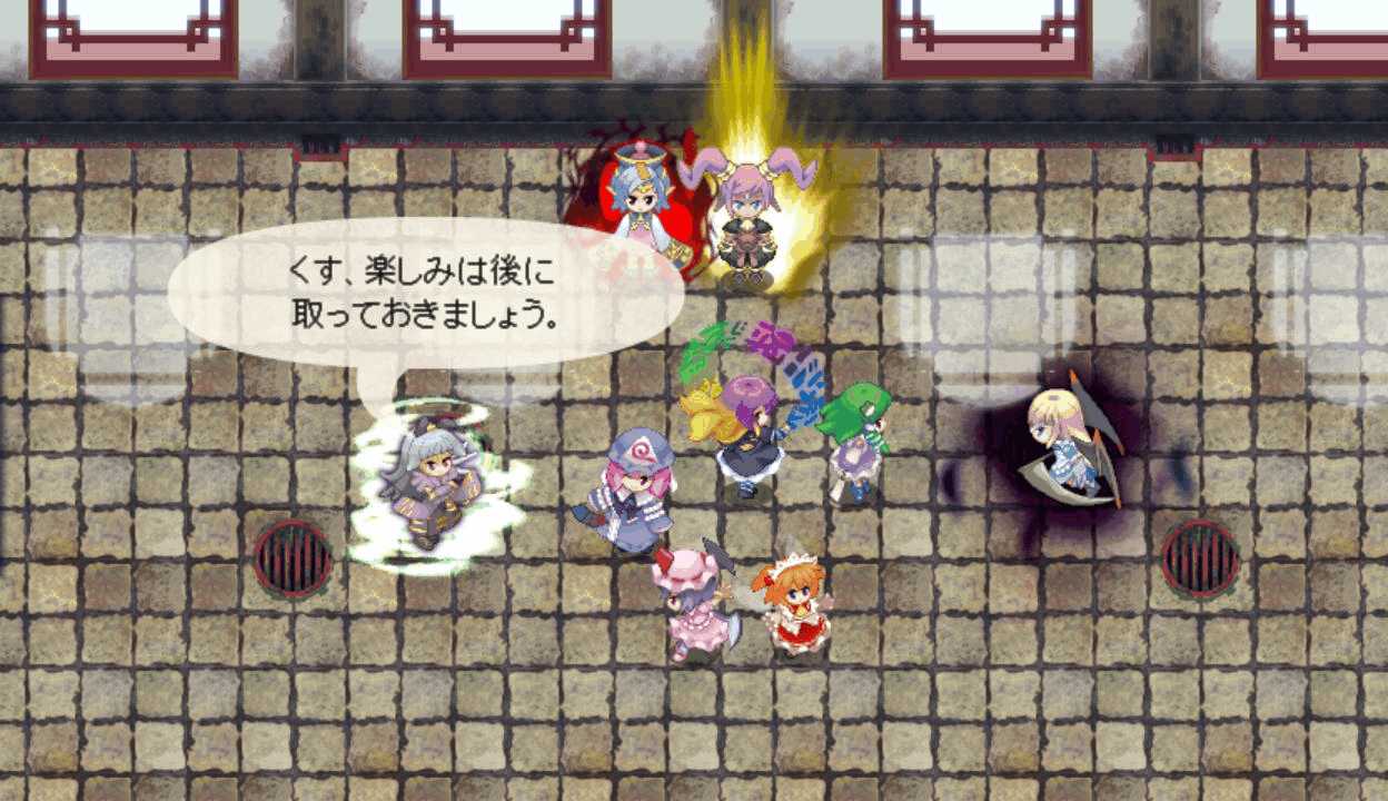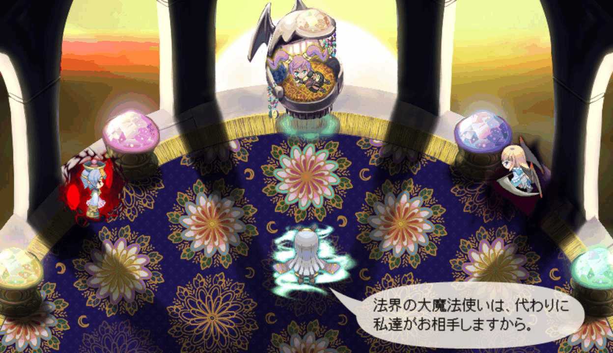 メイド妖精はLVを上げると強力な4属性魔法を習得 魔法系キャラに装備させると非常に便利全員に火属性攻撃を用意させ、ペリのチェイスを攻撃の主体にする 今度こそ勝ちたい12ターン目 長かった戦いがようやく終結!よっしゃー!ボス戦後のイベントで、終末の時計がタイムリミットに!うおーー!幻想郷の中心を貫いて巨大な塔が出現!出た!なんかすごいオーラまとってる!三魔柱の総大将にして異変の真の黒幕アンラ!こいつがラスボスか!倒した三魔柱が終結!次は本気でリベンジマッチすることになりそう三層から一層までを貫く魔城 一体どれだけの広さを持つのか三魔柱とアンラの会話 オリキャラだけど個性が立ってて掛け合いが面白い一斉に罵倒されるドジっ娘こと朱麗 一人だけ言い方が辛辣だよ!?なんかすごいパワーアップした!次は本気の本気で戦うということか