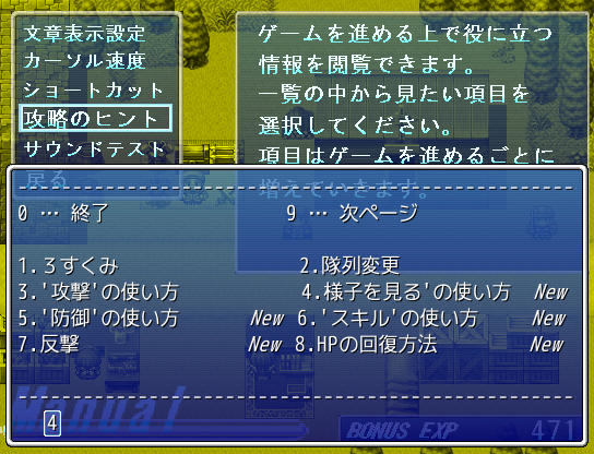 パッケージ内のテキストファイルなどにはゲームの内容に関する詳しいマニュアルは用意してないので、わからないことがあったらこの機能を使ってみてください