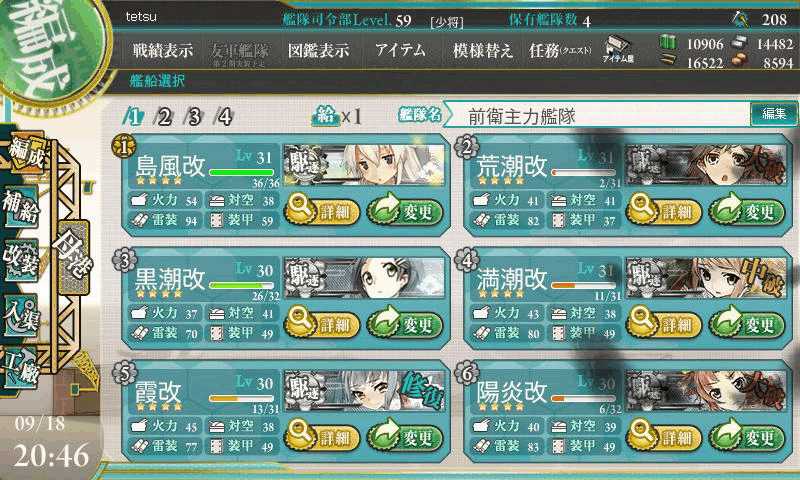 気長に取り組むしかないようなので、能力の高そうな駆逐艦を捕まえては出撃や遠征に駆逐艦を3隻組んでレベル上げをすること2週間、手塩にかけて育てた駆逐艦の平均LVは30を超えました