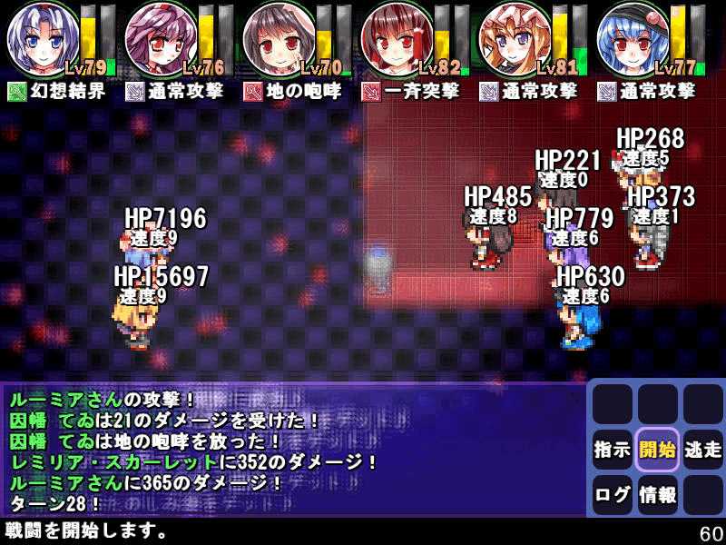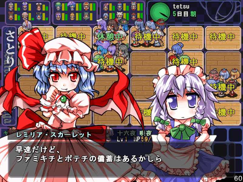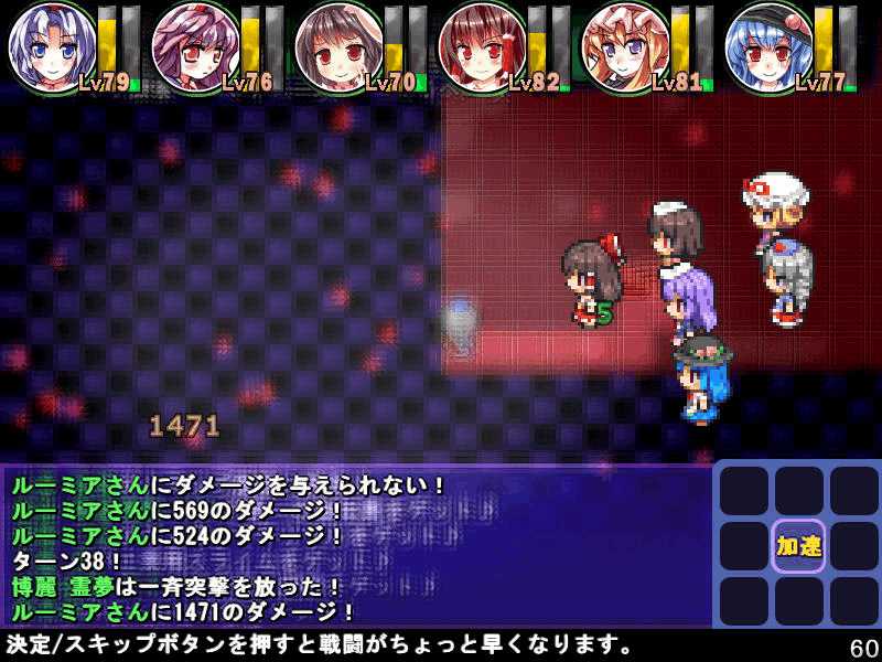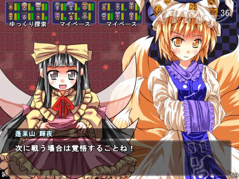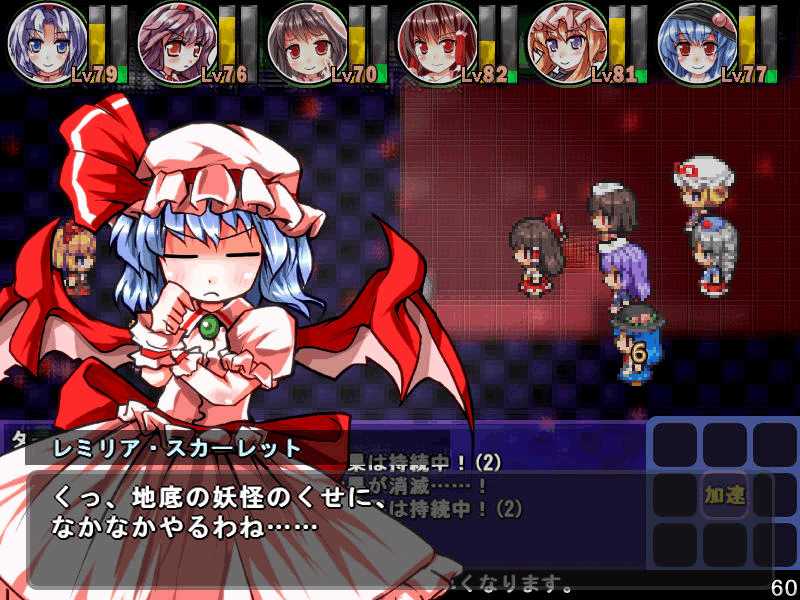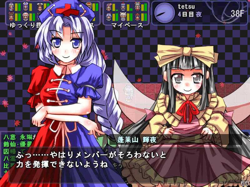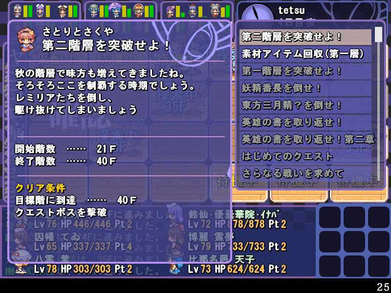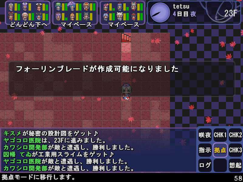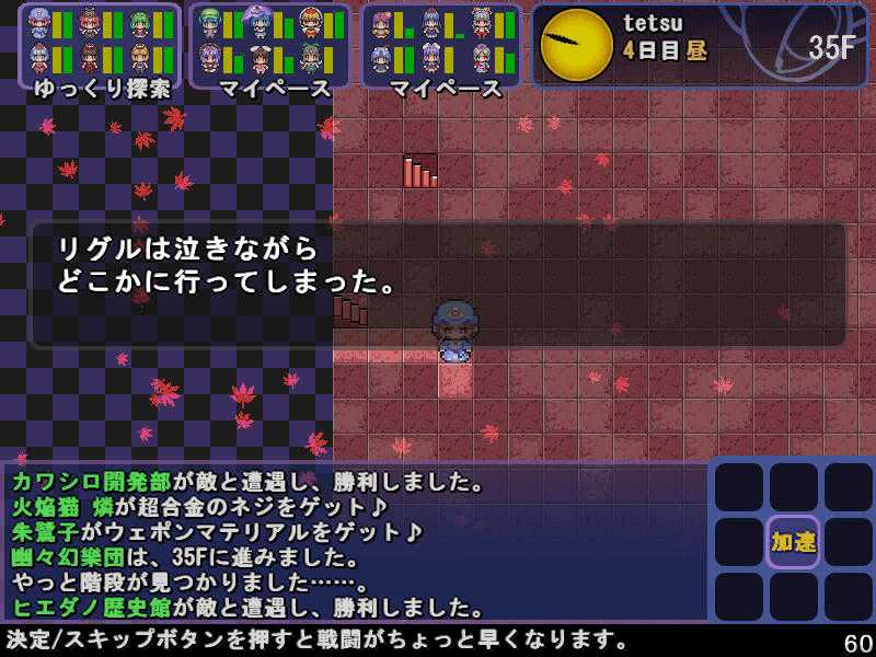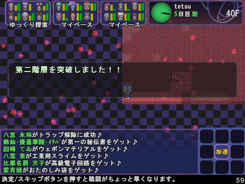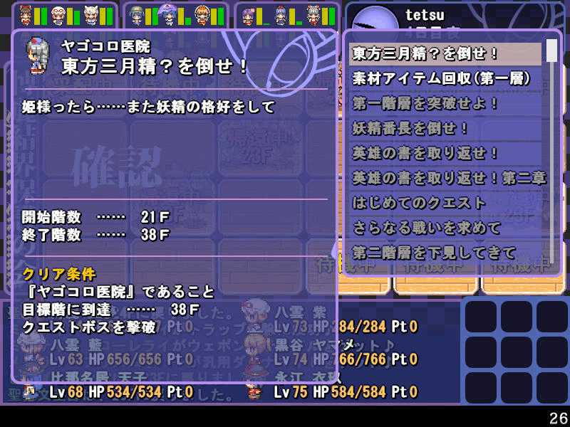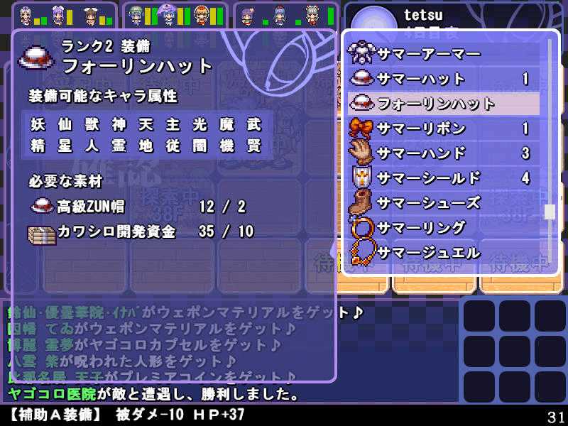 相手は一人だ!かかれーーーー!!!(笑) あまりにも楽勝すぎたw そりゃ泣くわw 次のクエストは博麗結界保護の会で輝夜?とボス戦 取り巻きはザコなので、苦戦せずに倒せるはず 負け惜しみを言って立ち去ってしまった 次のクエストではヤゴコロ医院で輝夜を追跡することに この段階でようやく、今までよりランクの高い装備が開発可能になった!フォーリン系はサマー系より必要素材が多い分高性能だ38Fで再び輝夜と戦闘 今度はスターもいるが、今の主力メンバーの敵でない また負け惜しみ言ってる… 次はいよいよ第2階層の最深部へ このクエストはパーティ指定がないので好きなキャラで挑める 最深部でレミリア率いるパーティが立ちふさがる! しまった、ここに来る途中のトラップでダメージ受けてるじゃないか!これは不利! しかし補助スキルを併用することでHPの消耗を最小限に 戦況はこちらが優勢 ここまでくればあとはオート戦闘でボコってよし! 見事レミリアたちを撃破! そこへあの四季四天王が乱入!これは面倒くさいことになりそうだ! 何はともあれ第二階層突破!次は冬の階層かな? レミリアたちが参入 ファミチキ要求してきたwww 初期LVが高いので、育てなくても即戦力になりそう