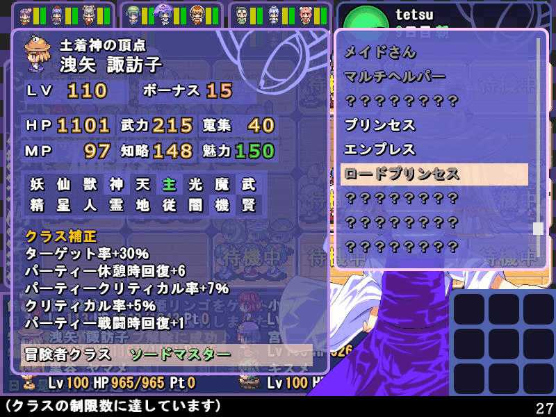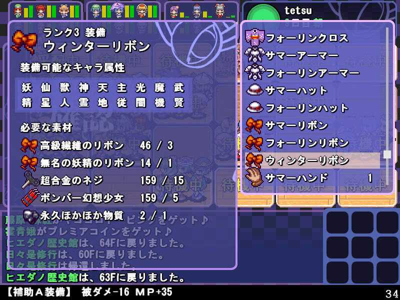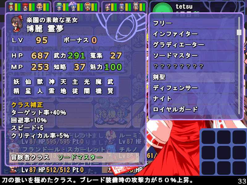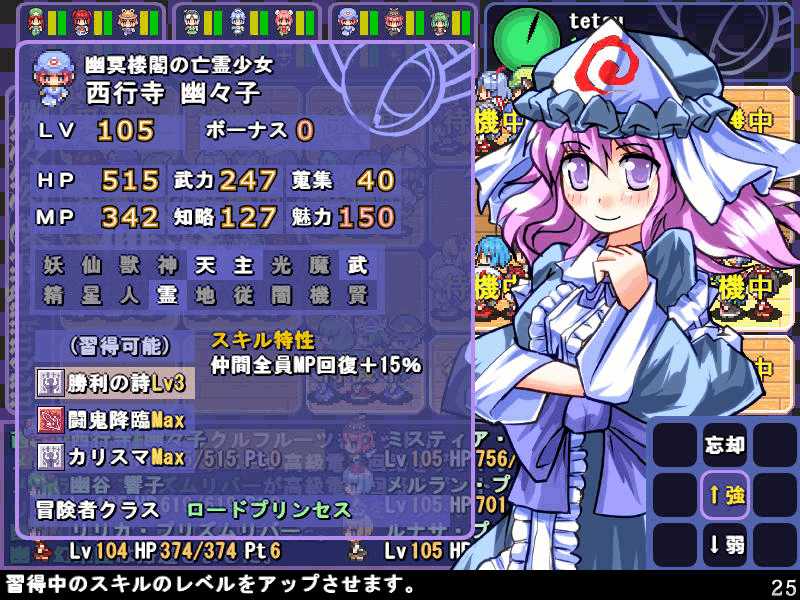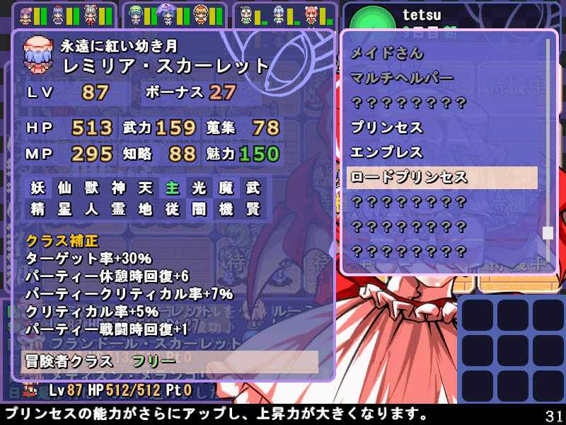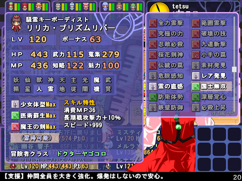 英雄の書のクエストもこれで4回目 ついに最上位クラス解放か? 今度は魔理沙も登場! 春の階層の状態異常もあってかなり苦戦 辛くも勝利(^-^; え~~まだ全部読めないの~? 解放された最上位クラス、ロードプリンセス 最上位クラスの強力なスキルを習得するには、通常の4倍のボーナス点が必要だ! 専用スキルのカリスマは、パーティ全員の経験値量を3倍にするぞ! しかし、最上位クラスは全キャラで一人しか転職できないので注意! ここでようやく冬装備開発 冬の階層クリアした後なのに遅すぎw ランク3の冬装備は強力な分多くの素材が必要 最上位クラス剣聖 ブレードを装備すると攻撃力が1.5に! とあるクエストをクリアすると強力な装備が開発できるように 開発にはレア素材が必要だが リグルを撃退するクエスト ヒャッハー!! げげっ、綿月姉妹!!なぜに!?敵は4人パーティだった 強いwダメでしたわー!\(^o^)/ 最上位クラスの……なんだこれwww 最上位クラスになるには高いステータスが要求される LVが低いとスキルを習得するボーナスが足りなくなるぞ 最上位クラスドクターヤゴコロ専用スキル 使うの怖いんですけどw