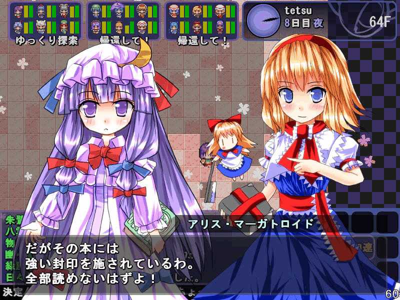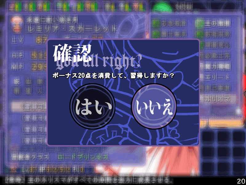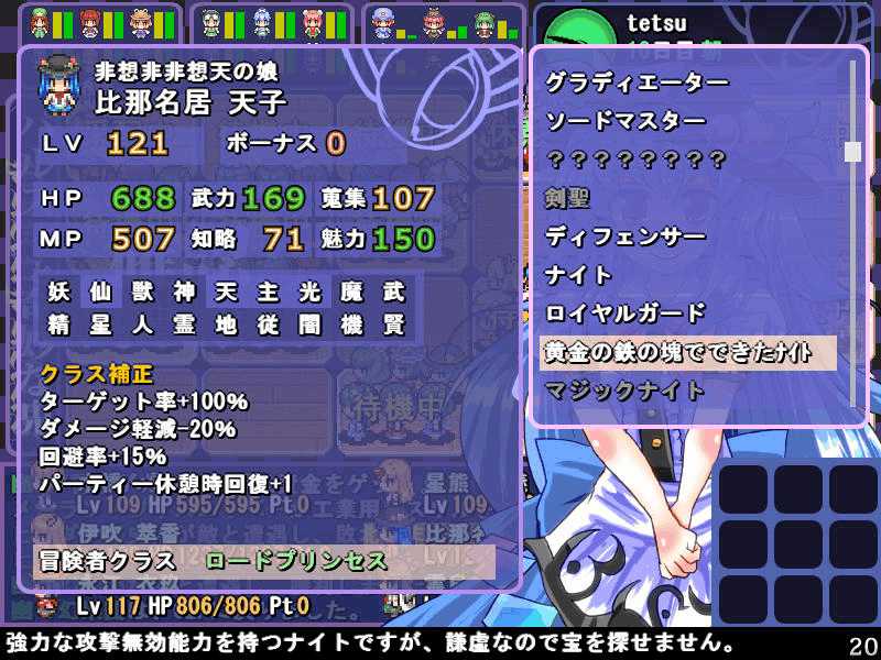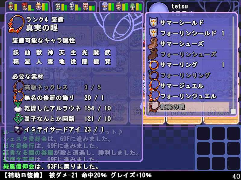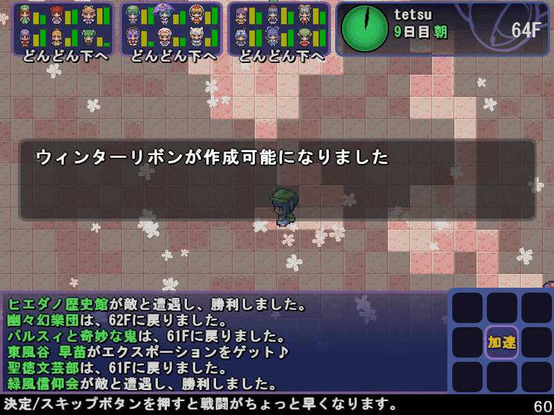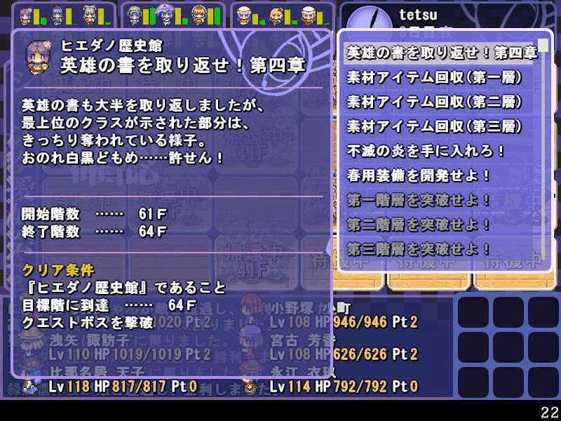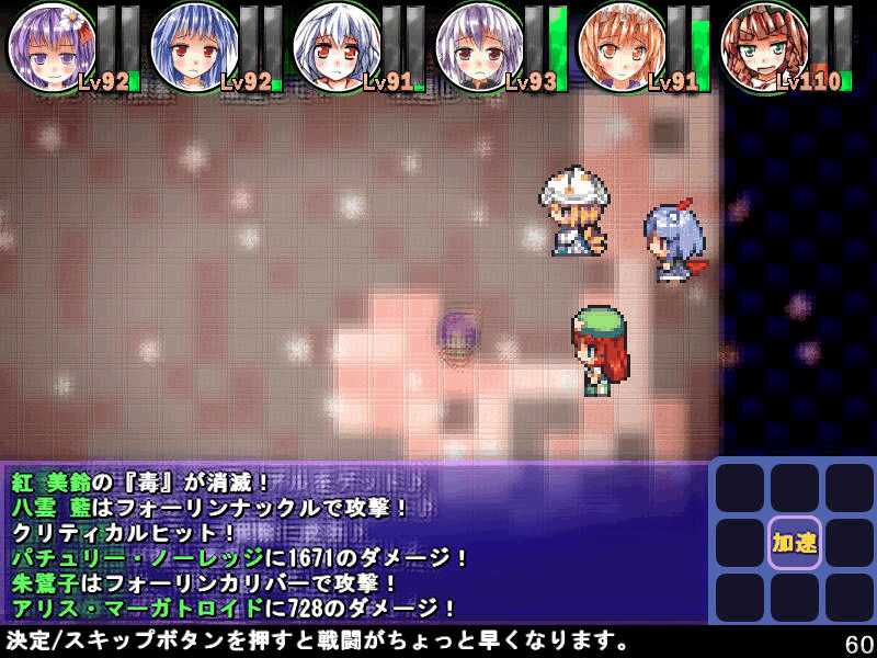 英雄の書のクエストもこれで4回目 ついに最上位クラス解放か? 今度は魔理沙も登場! 春の階層の状態異常もあってかなり苦戦 辛くも勝利(^-^; え~~まだ全部読めないの~? 解放された最上位クラス、ロードプリンセス 最上位クラスの強力なスキルを習得するには、通常の4倍のボーナス点が必要だ! 専用スキルのカリスマは、パーティ全員の経験値量を3倍にするぞ! しかし、最上位クラスは全キャラで一人しか転職できないので注意! ここでようやく冬装備開発 冬の階層クリアした後なのに遅すぎw ランク3の冬装備は強力な分多くの素材が必要 最上位クラス剣聖 ブレードを装備すると攻撃力が1.5に! とあるクエストをクリアすると強力な装備が開発できるように 開発にはレア素材が必要だが リグルを撃退するクエスト ヒャッハー!! げげっ、綿月姉妹!!なぜに!?敵は4人パーティだった 強いwダメでしたわー!\(^o^)/ 最上位クラスの……なんだこれwww 最上位クラスになるには高いステータスが要求される LVが低いとスキルを習得するボーナスが足りなくなるぞ 最上位クラスドクターヤゴコロ専用スキル 使うの怖いんですけどw