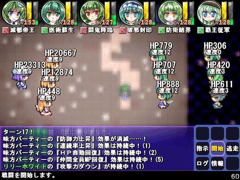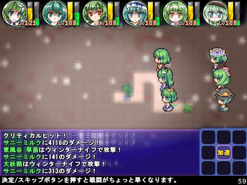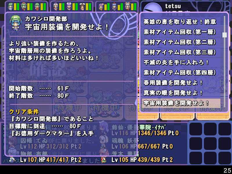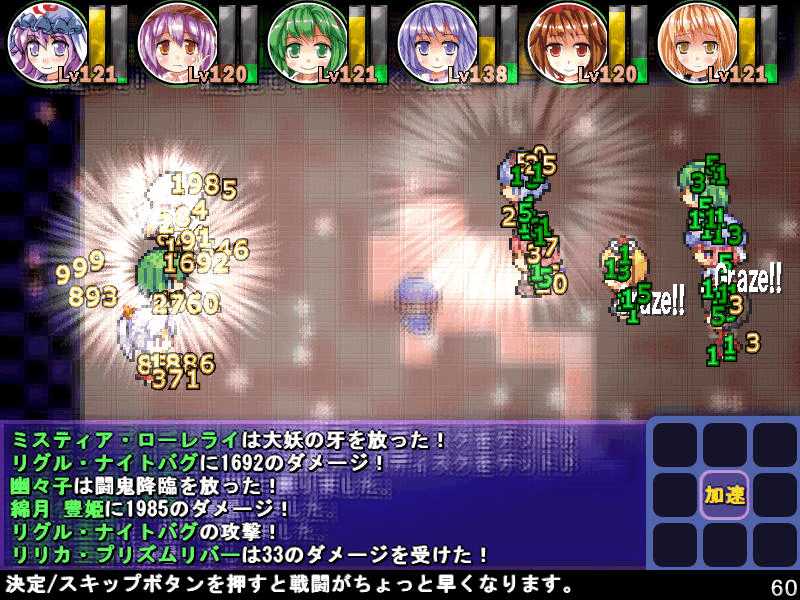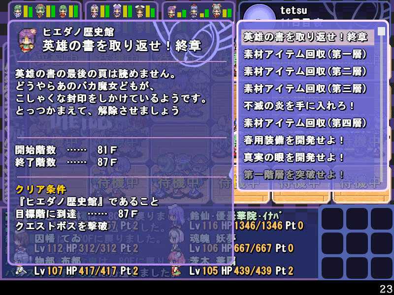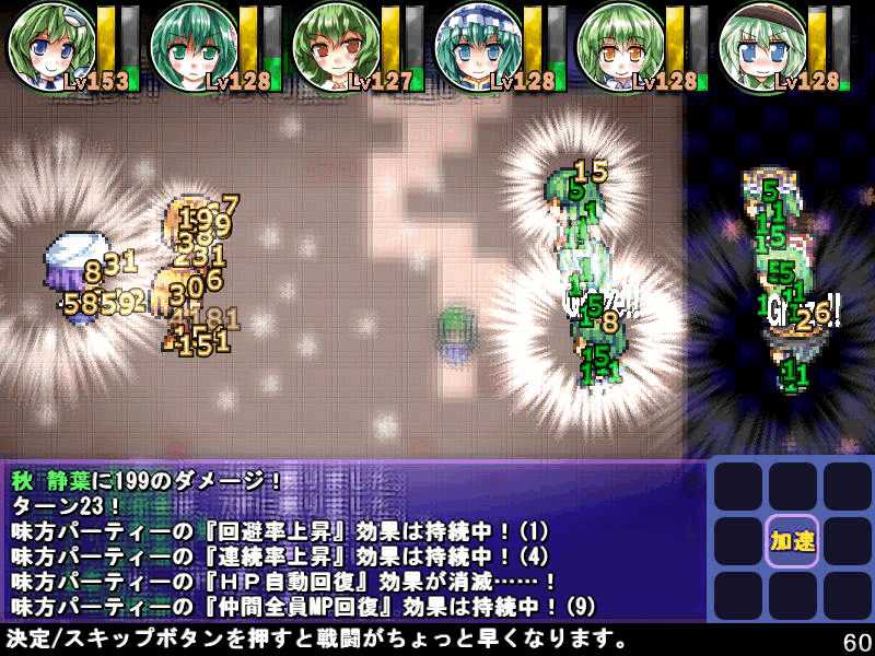 LV上げまくってリグルに再挑戦だ! 1人撃破できればあとは高速化でフルボッコ! 勝った!みすちーやられたけどw 料理で綿月姉妹を釣って仲間に引き入れた 流石、原作の設定通り(?)かなりの強キャラ お次は緑風信仰会VS三月精+輝夜 特に苦労もせず撃破できたw また逃げられた!最深部に追い詰めないとダメ? 第四層の最深部では四季四天王と対決するが、自分が仕掛けた罠にはまっていたw 5vs6のバトルだ! 補助効果で固めればダメージはほぼ受けない!まず一人撃破! 2人撃破したらあとは高速化でOKでしょう♪ 四季四天王が仲間になってしまった。え??(笑) いよいよ最終エリアの第五層へ 再び永琳達が人柱になることに(^^; 第五層は宇宙!四季の最後は宇宙ときたか、そうか なにぃ!?これは厄介だ!通常攻撃メインのクラスなら問題ないか? 英雄の書関連のクエストもこれが最後か このクエストで素材を集めればMP減少の効果を防止できそうだ