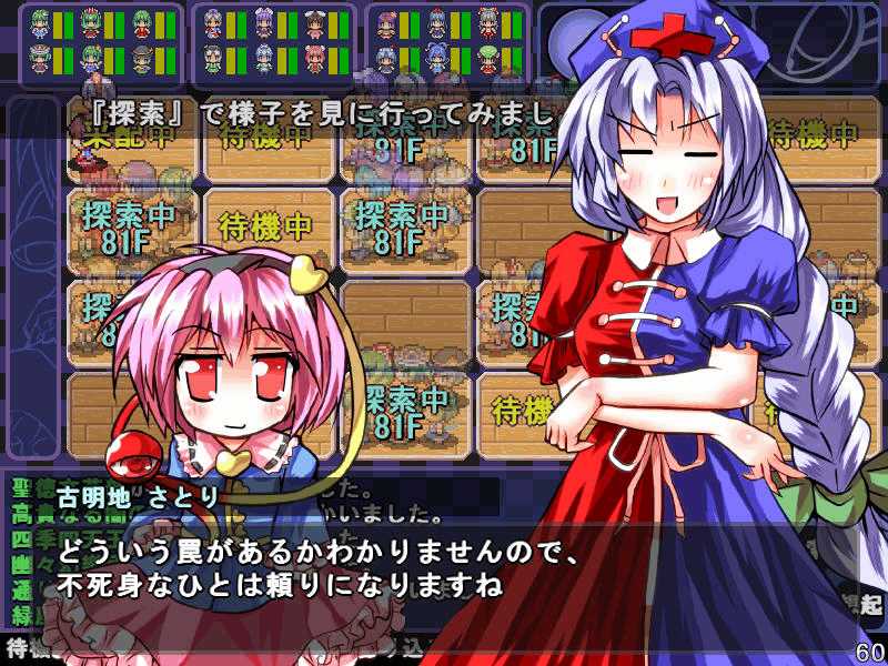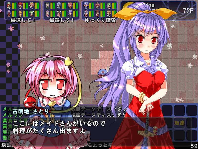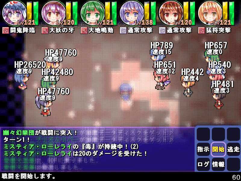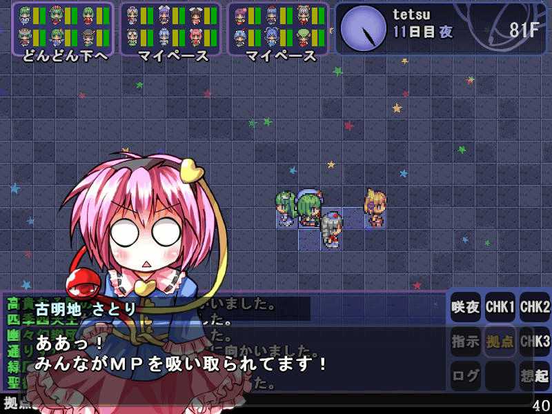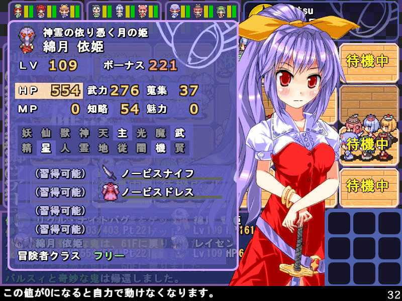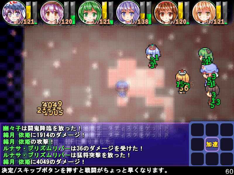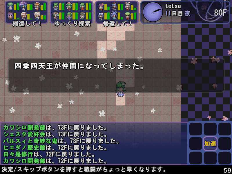 LV上げまくってリグルに再挑戦だ! 1人撃破できればあとは高速化でフルボッコ! 勝った!みすちーやられたけどw 料理で綿月姉妹を釣って仲間に引き入れた 流石、原作の設定通り(?)かなりの強キャラ お次は緑風信仰会VS三月精+輝夜 特に苦労もせず撃破できたw また逃げられた!最深部に追い詰めないとダメ? 第四層の最深部では四季四天王と対決するが、自分が仕掛けた罠にはまっていたw 5vs6のバトルだ! 補助効果で固めればダメージはほぼ受けない!まず一人撃破! 2人撃破したらあとは高速化でOKでしょう♪ 四季四天王が仲間になってしまった。え??(笑) いよいよ最終エリアの第五層へ 再び永琳達が人柱になることに(^^; 第五層は宇宙!四季の最後は宇宙ときたか、そうか なにぃ!?これは厄介だ!通常攻撃メインのクラスなら問題ないか? 英雄の書関連のクエストもこれが最後か このクエストで素材を集めればMP減少の効果を防止できそうだ