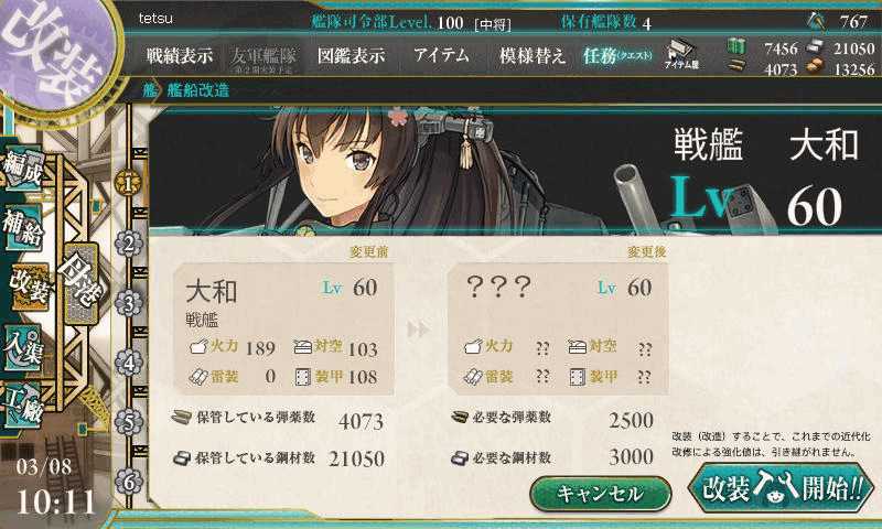 大和の改造可能レベルは全艦娘中最高の60LVだったんですが、4日間でここまで到達、改造を果たしました