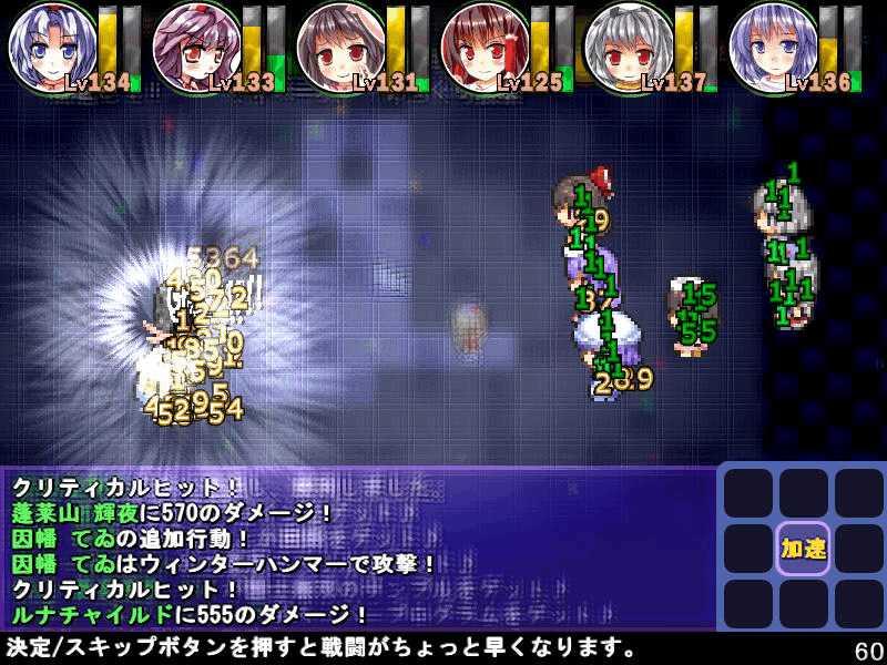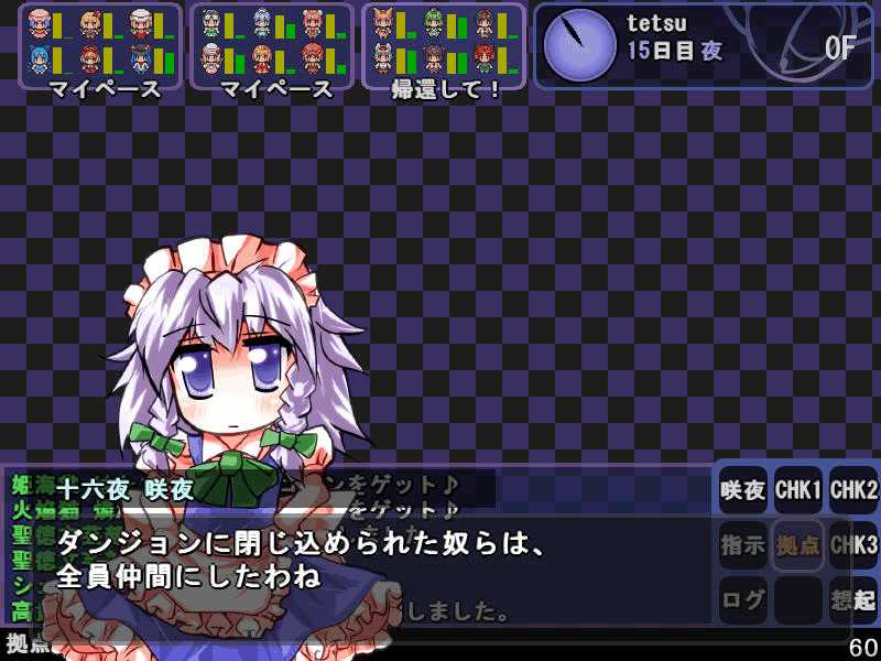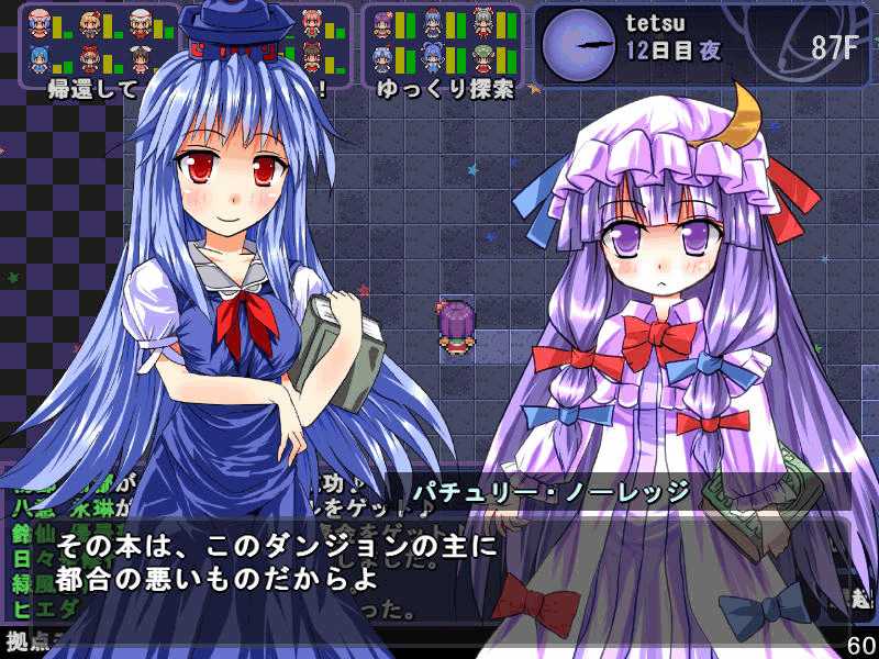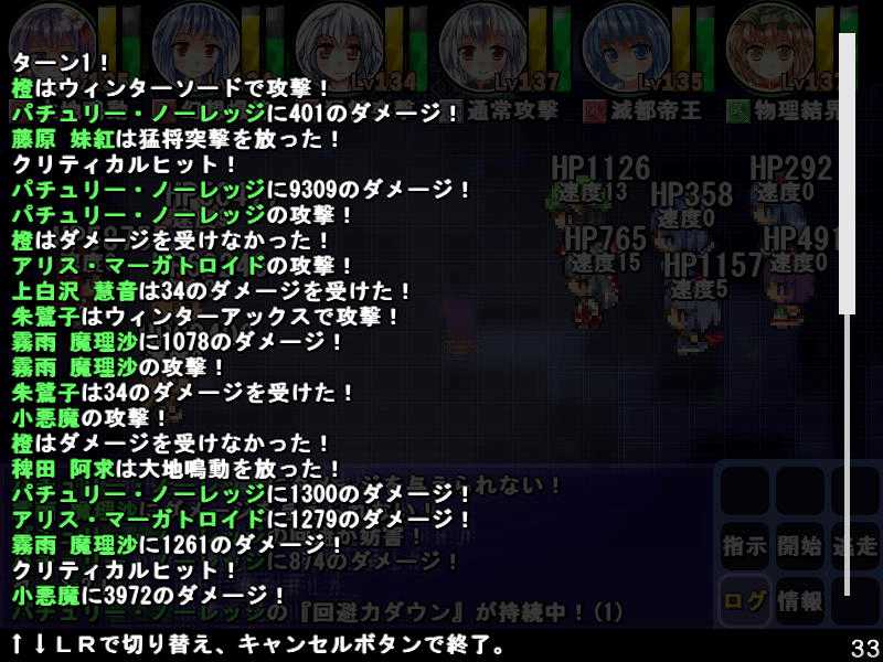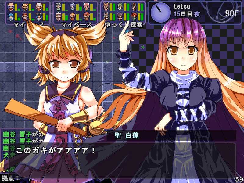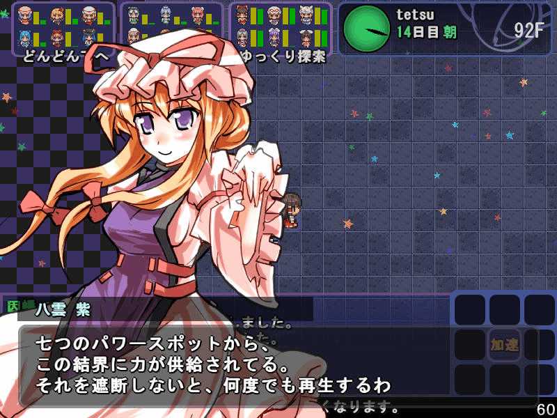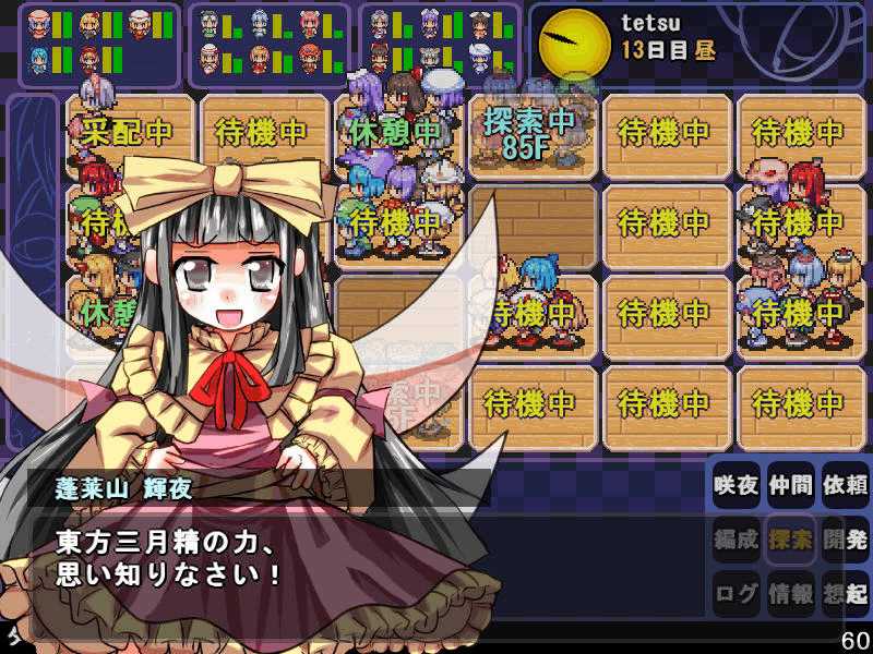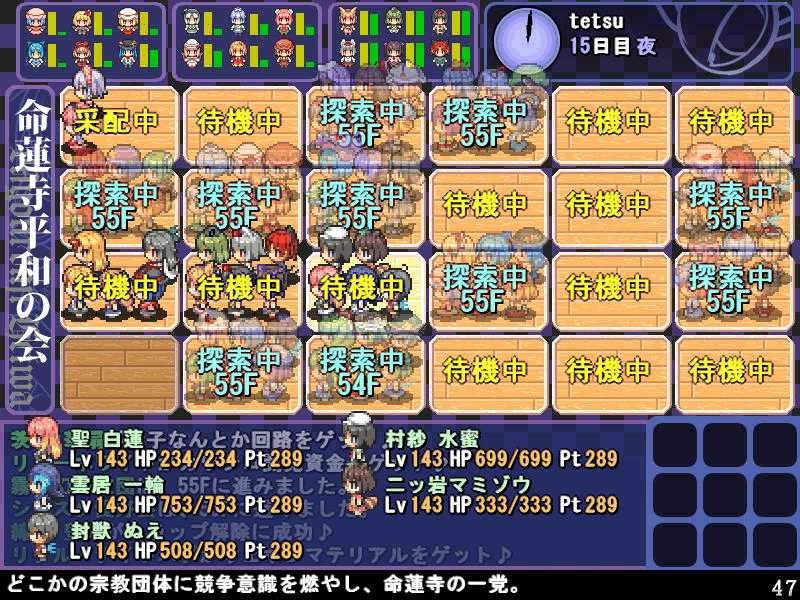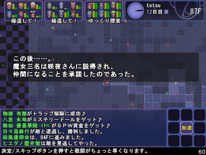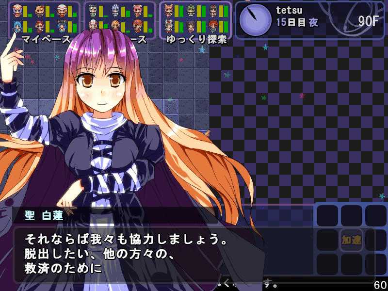 英雄の書シリーズの終章 ダンジョンの主は英雄の書により力をつけた冒険者に倒されることを恐れている そしてその主に加担する魔理沙たち ダンジョンの主は当然、魔理沙たちより強い力を持っている 魔女たちとのラストバトル 全員がかなりのHPをもつ強敵 でも剣聖のクラスでクリティカルの威力を高めた妹紅は10000近いダメージを与えられた 全員生存で撃破できた! 魔理沙やアリスに縁のある者が異変の黒幕…? ようやく魔理沙たちが仲間になった 拠点に戻るといきなり黒幕の神綺が乗り込んできた! 黒幕は旧作のラスボスだった 最深層が宇宙のエリアになってるのもそのせいか 最深層へは結界を破壊しないと進めないようだ 一方、三月精と行動を共にする輝夜と最後の戦い HPはそんなに多くないのでボコって終了 やっと仲間になった 霊夢たちが結界の偵察に向かうと、結界の守護者が挑んできた!でも少し強い程度のザコ妖精? パワースポットが全部で7つあり、それを全て破壊する必要があるらしい それは手間のかかる… 7つの封印はそれぞれ得意とするパーティが破壊を担当することになる 結界の力の化身はボスにしては弱いので、育ててないパーティでも撃破できる 別のクエストでは神子と白蓮が因縁に決着をつける 言葉遣いwww 相手は5人パーティで、白蓮のHPがとても多い しかし複数の補助スキルで固めてやれば問題なく撃破できる さとりがダンジョン攻略の事情を説明するとあっさり仲間になってくれた 白蓮たちも勧誘したため、ダンジョンに閉じ込められた者は全員仲間になった! 最後に仲間になっただけあり、初期LVが非常に高い命蓮寺組 なぜか一輪の頭身が低い というか後ろの雲山が怖いw