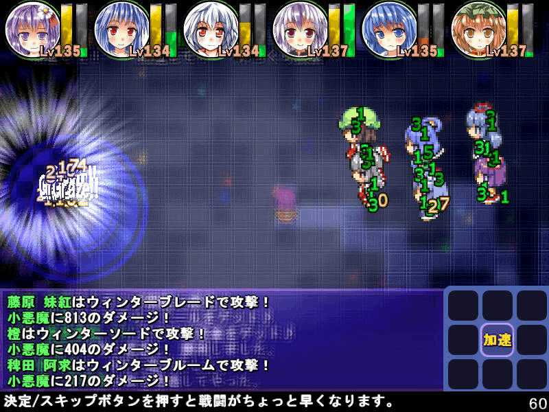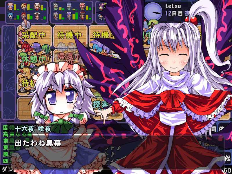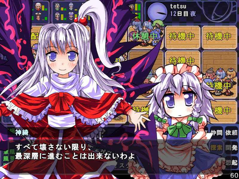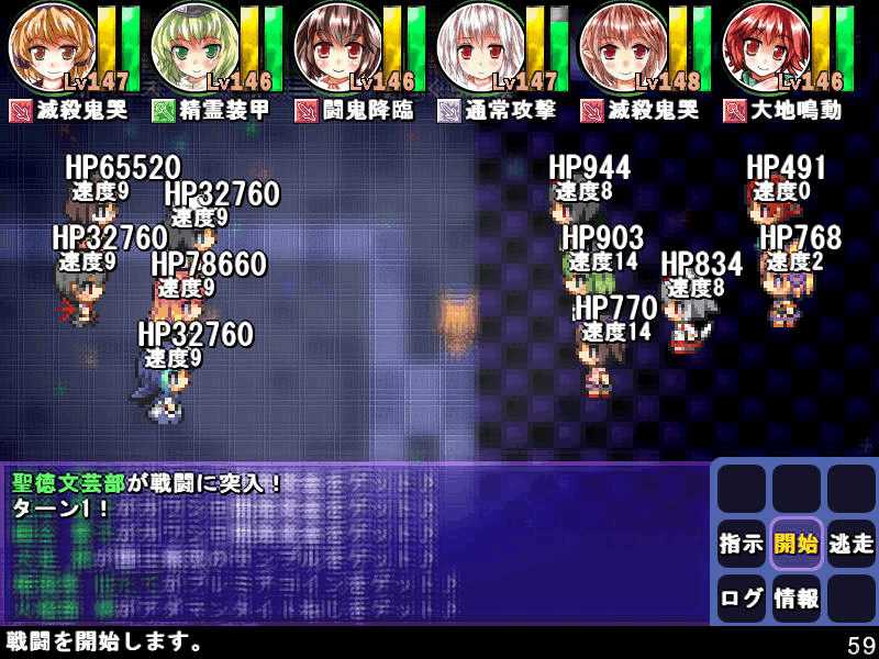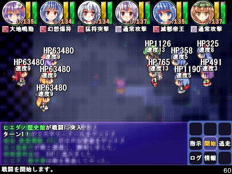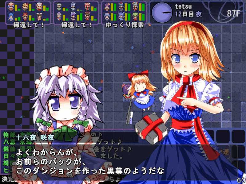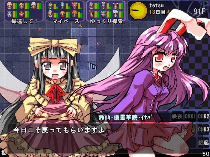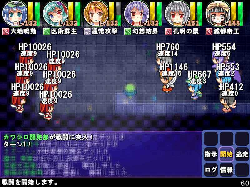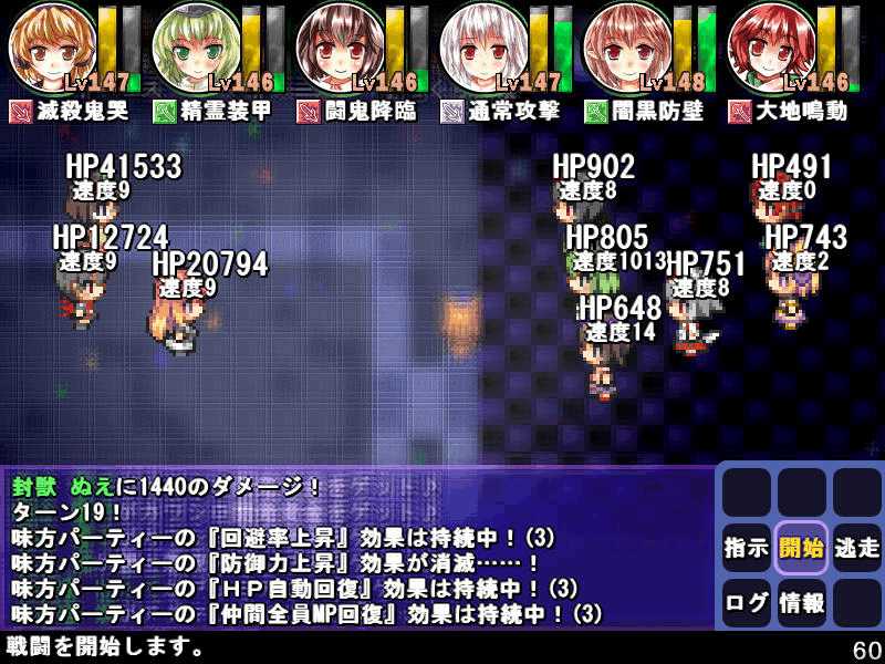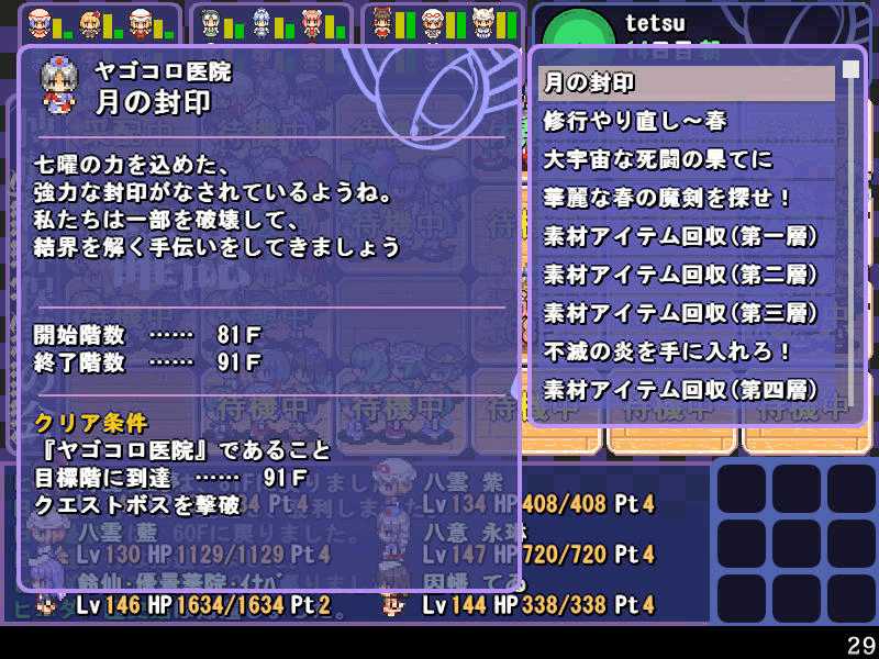 英雄の書シリーズの終章 ダンジョンの主は英雄の書により力をつけた冒険者に倒されることを恐れている そしてその主に加担する魔理沙たち ダンジョンの主は当然、魔理沙たちより強い力を持っている 魔女たちとのラストバトル 全員がかなりのHPをもつ強敵 でも剣聖のクラスでクリティカルの威力を高めた妹紅は10000近いダメージを与えられた 全員生存で撃破できた! 魔理沙やアリスに縁のある者が異変の黒幕…? ようやく魔理沙たちが仲間になった 拠点に戻るといきなり黒幕の神綺が乗り込んできた! 黒幕は旧作のラスボスだった 最深層が宇宙のエリアになってるのもそのせいか 最深層へは結界を破壊しないと進めないようだ 一方、三月精と行動を共にする輝夜と最後の戦い HPはそんなに多くないのでボコって終了 やっと仲間になった 霊夢たちが結界の偵察に向かうと、結界の守護者が挑んできた!でも少し強い程度のザコ妖精? パワースポットが全部で7つあり、それを全て破壊する必要があるらしい それは手間のかかる… 7つの封印はそれぞれ得意とするパーティが破壊を担当することになる 結界の力の化身はボスにしては弱いので、育ててないパーティでも撃破できる 別のクエストでは神子と白蓮が因縁に決着をつける 言葉遣いwww 相手は5人パーティで、白蓮のHPがとても多い しかし複数の補助スキルで固めてやれば問題なく撃破できる さとりがダンジョン攻略の事情を説明するとあっさり仲間になってくれた 白蓮たちも勧誘したため、ダンジョンに閉じ込められた者は全員仲間になった! 最後に仲間になっただけあり、初期LVが非常に高い命蓮寺組 なぜか一輪の頭身が低い というか後ろの雲山が怖いw