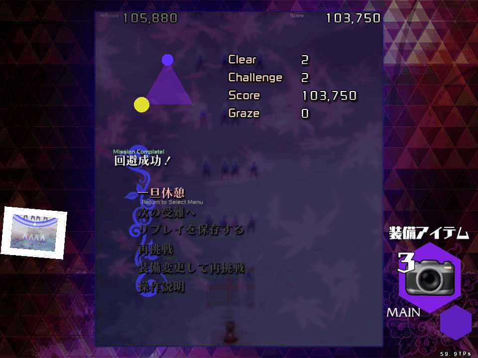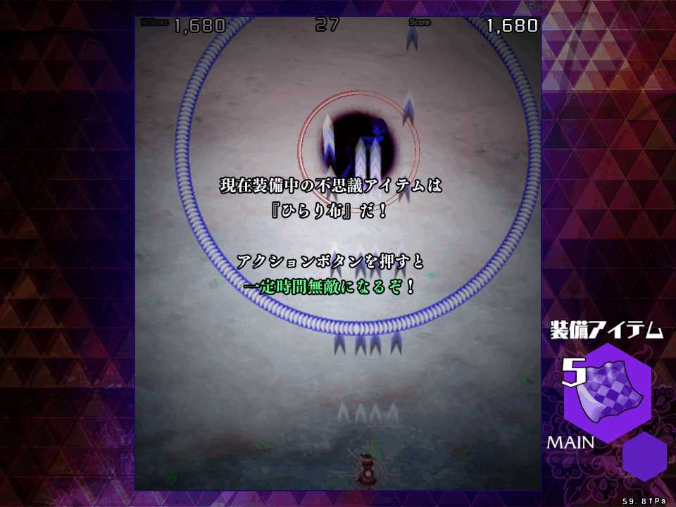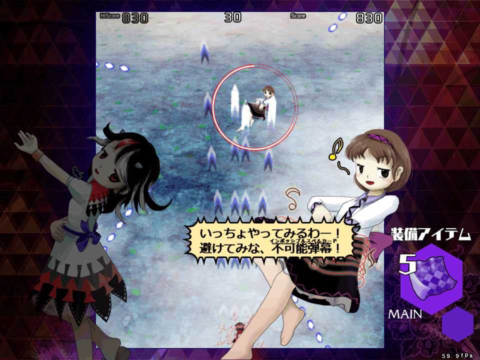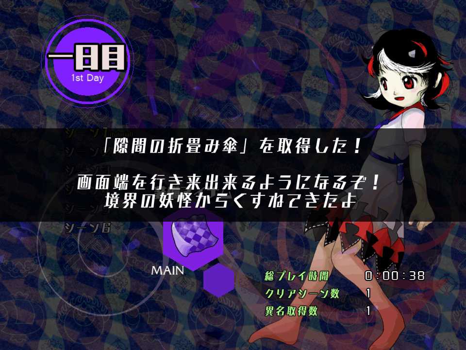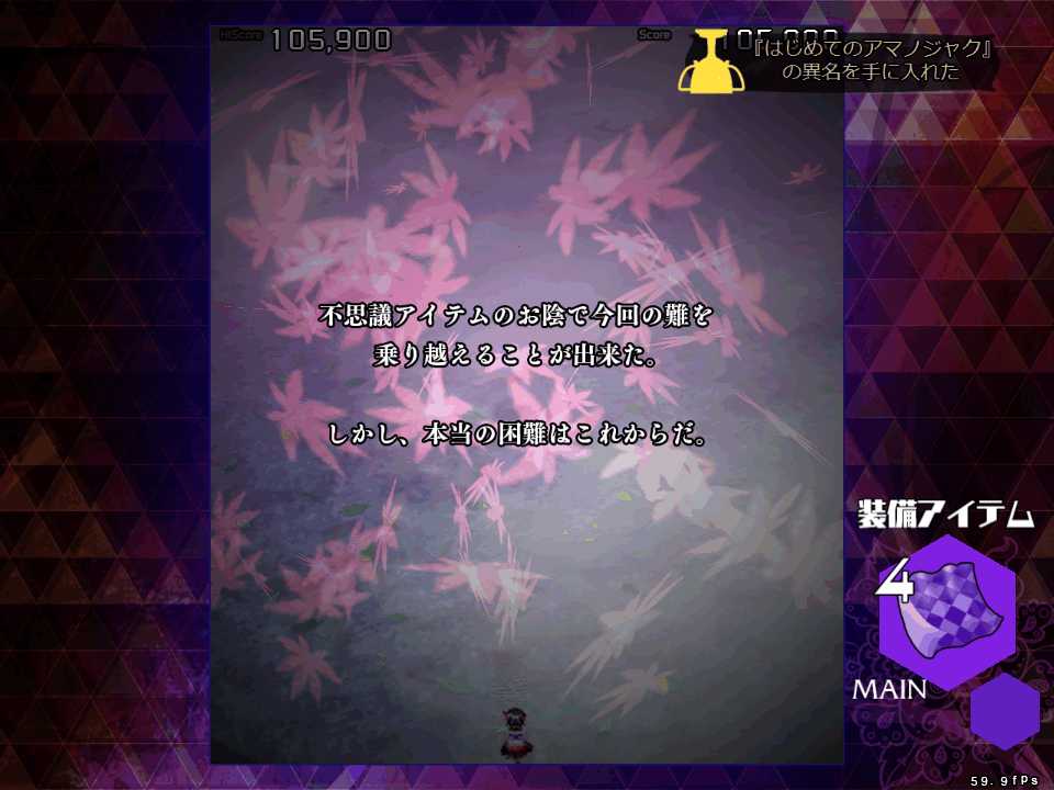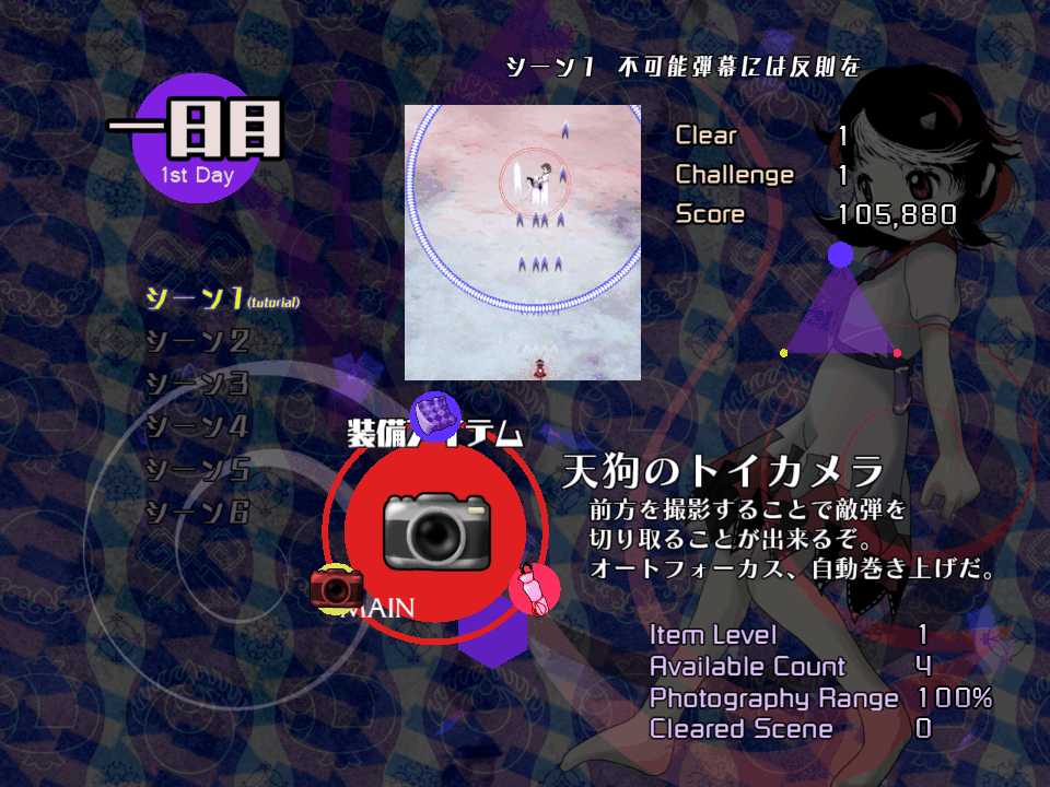 今作は1シーンがボスのスペルカード1枚で終了する短編集となっているので東方文花帖やダブルスポイラーに類似した作品になるんだけど、装備アイテムの種類はすなわち選択できる自機の種類となるので、自機が固定だった文花帖やダブルスポイラーと違って、装備を変更して同じシーンを何度もやりこむプレイスタイルになりそうだ