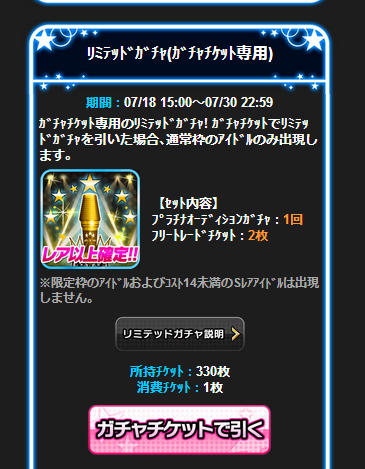 限定以外の恒常アイドルが含まれている枚数は全部で400枚なので、ガチャチケを400枚使用した後に課金ガチャを回せば、限定アイドルを確定で引くことが出来ます