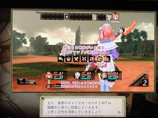 後衛はサポート行動しかできないけど、敵からターゲットにされないほか、戦闘中にHPとMPが少しずつ回復するというメリットがあります!