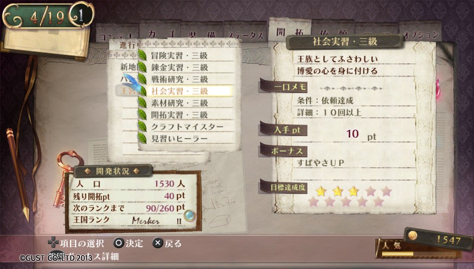 メルルでは開拓の項目で提示された目標を達成することで、開拓ptを貯め、王国のランクを上げていくのがゲームの主な目的となります